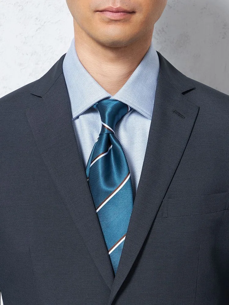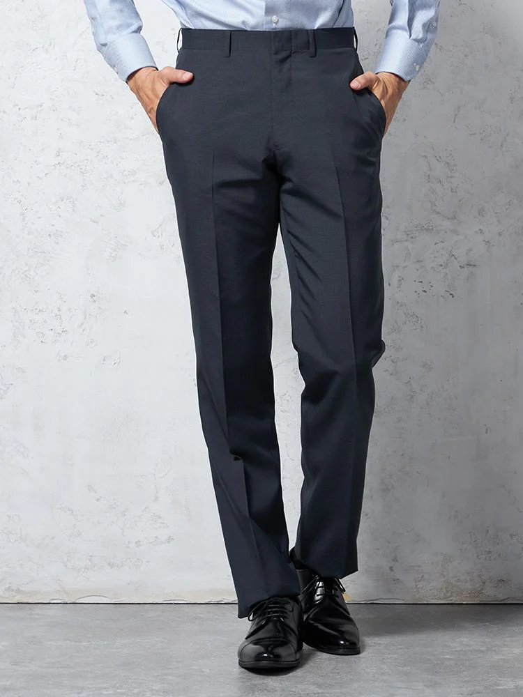 通年着用できるクリーンなネイビーのツーピーススーツ。