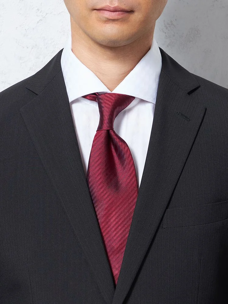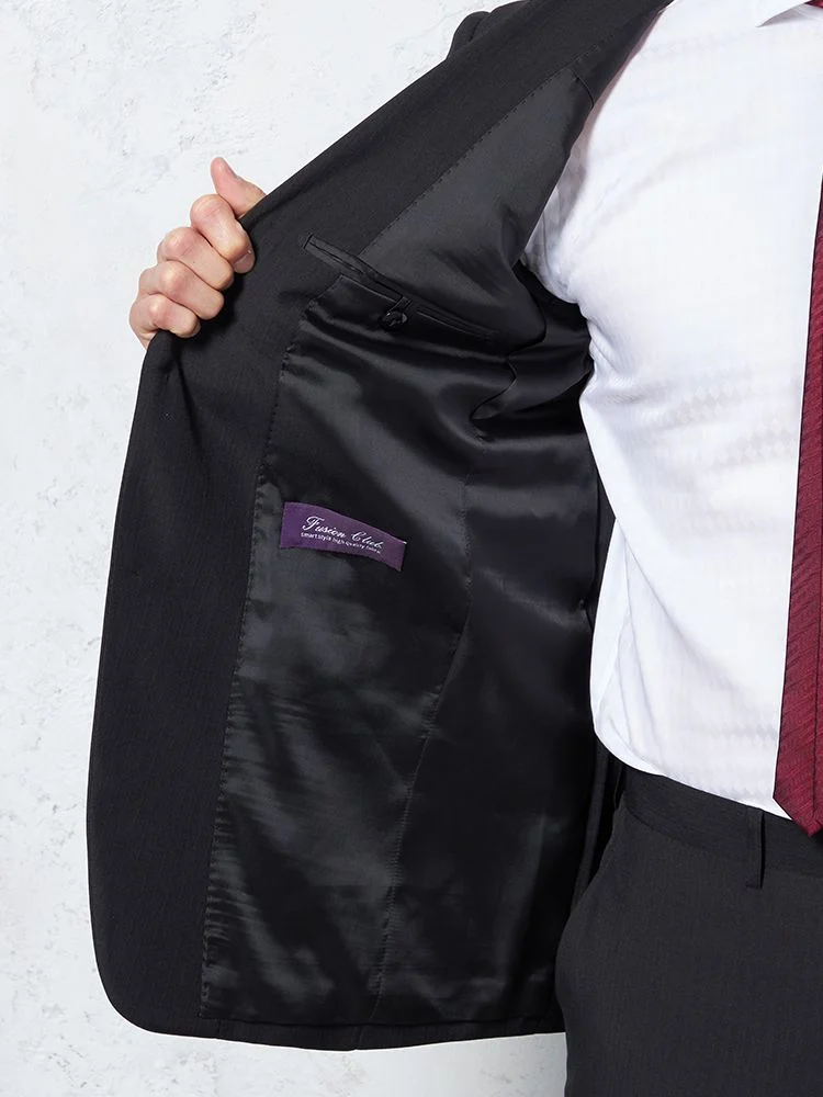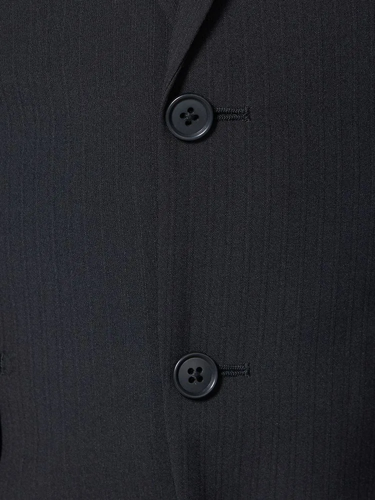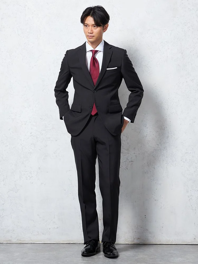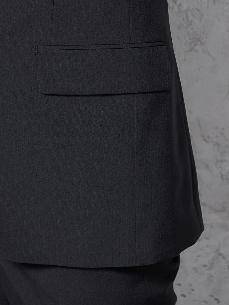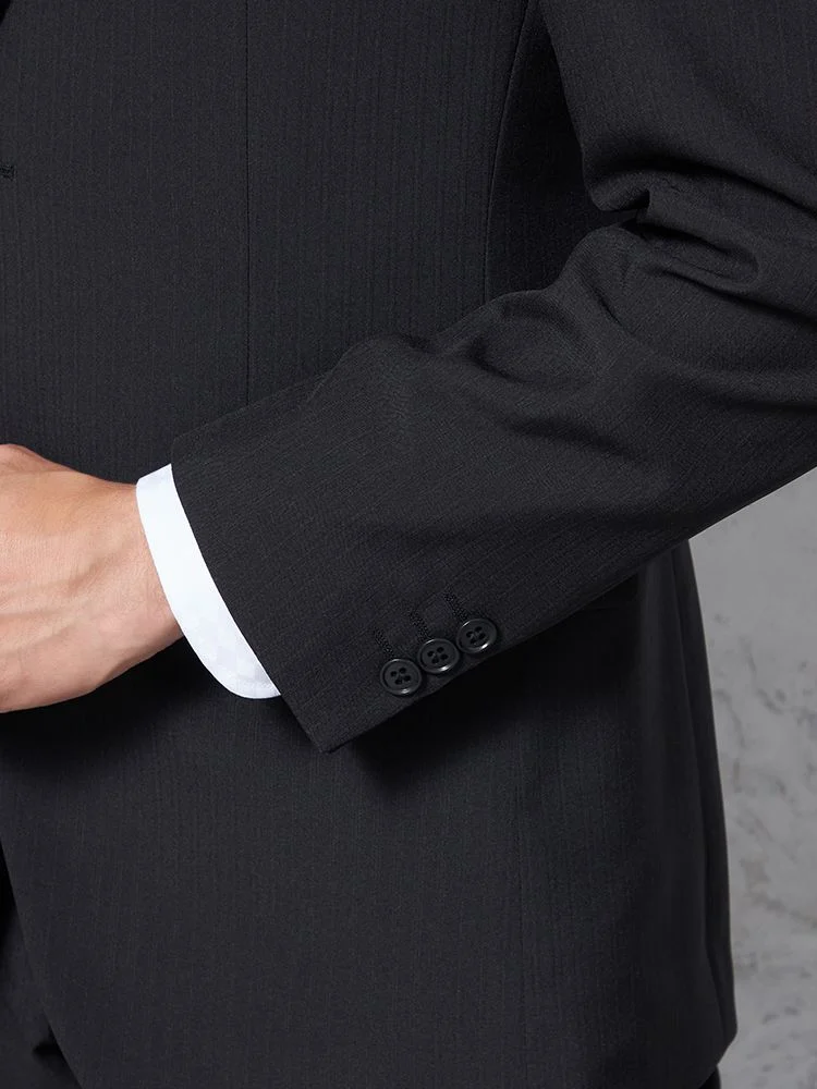 通年着用できるブラックストライプ生地のツーピーススーツ。