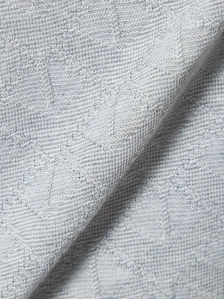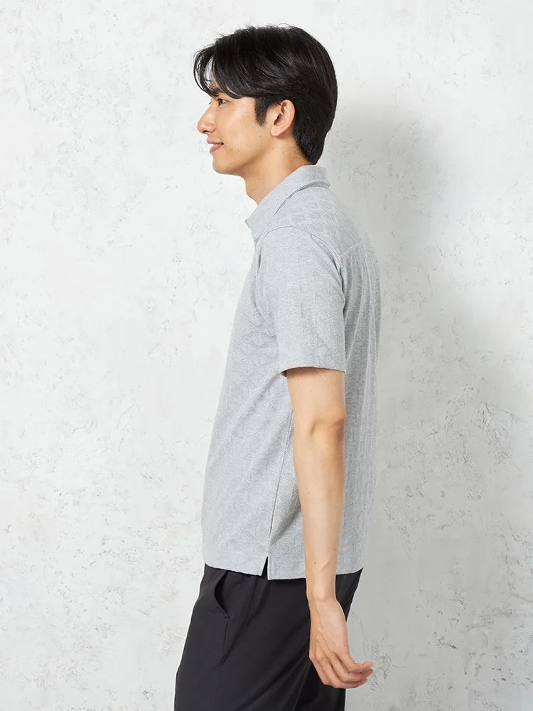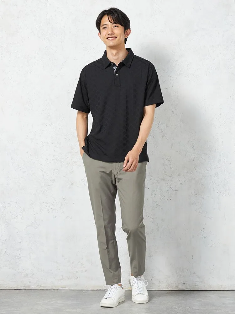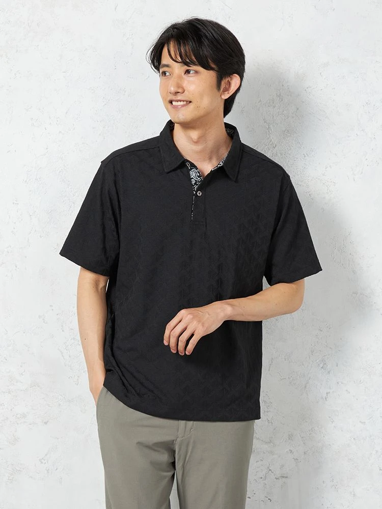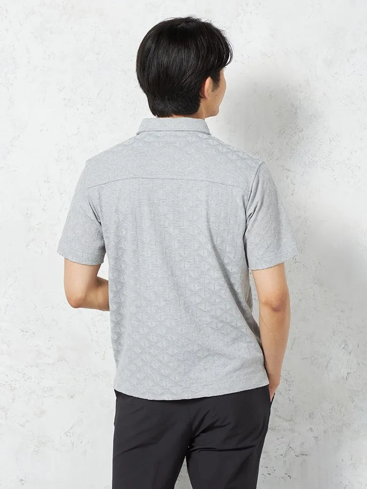 織りで幾何学柄を表現したポリエステル混素材ポロシャツ。