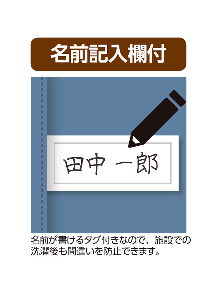名前が書けるタグ付きなので、施設での洗濯後も間違いを防止できて安心。