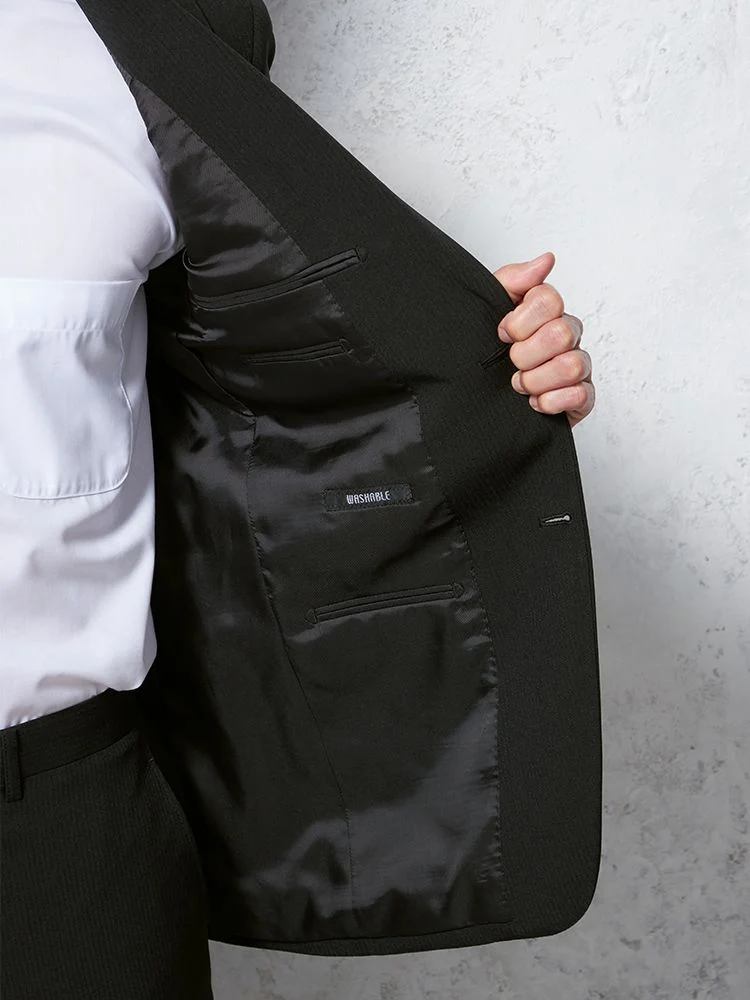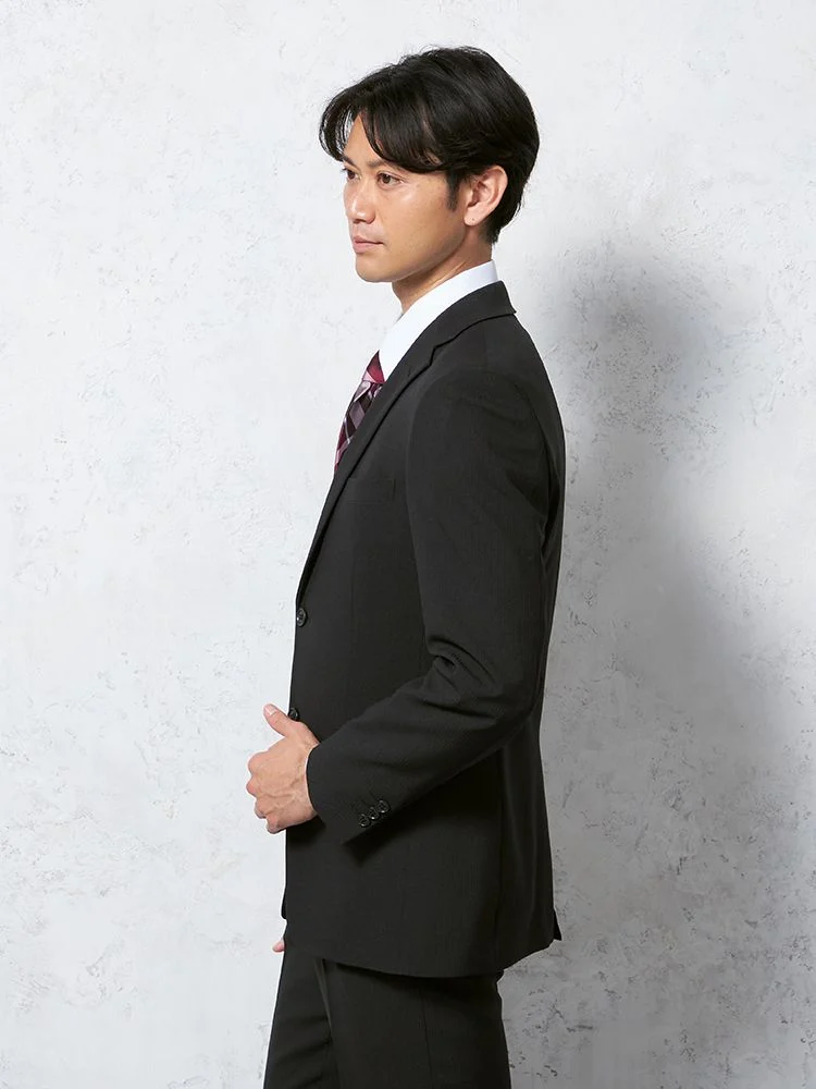 ベーシックなデザインで、シャツやネクタイを選ばず着用できるブラックスーツ。