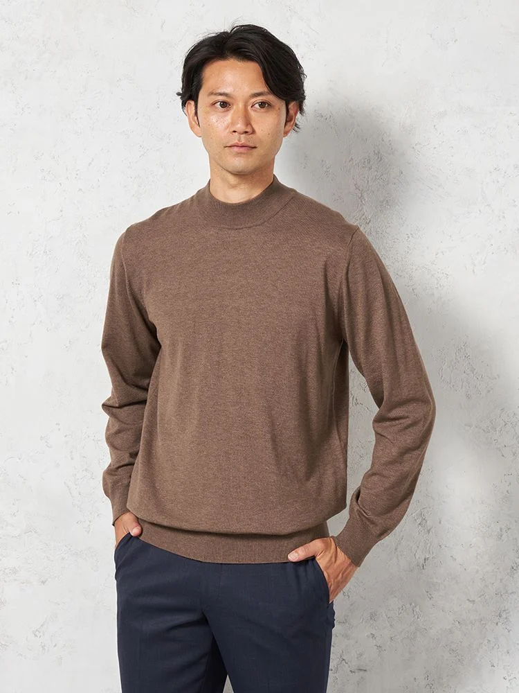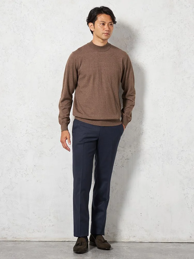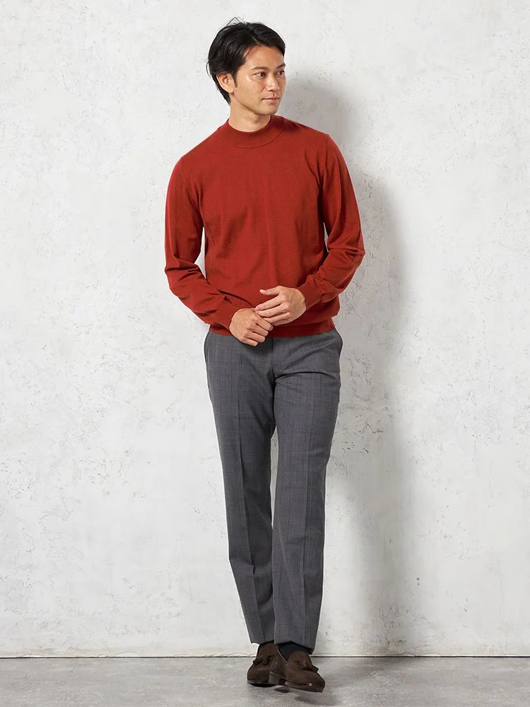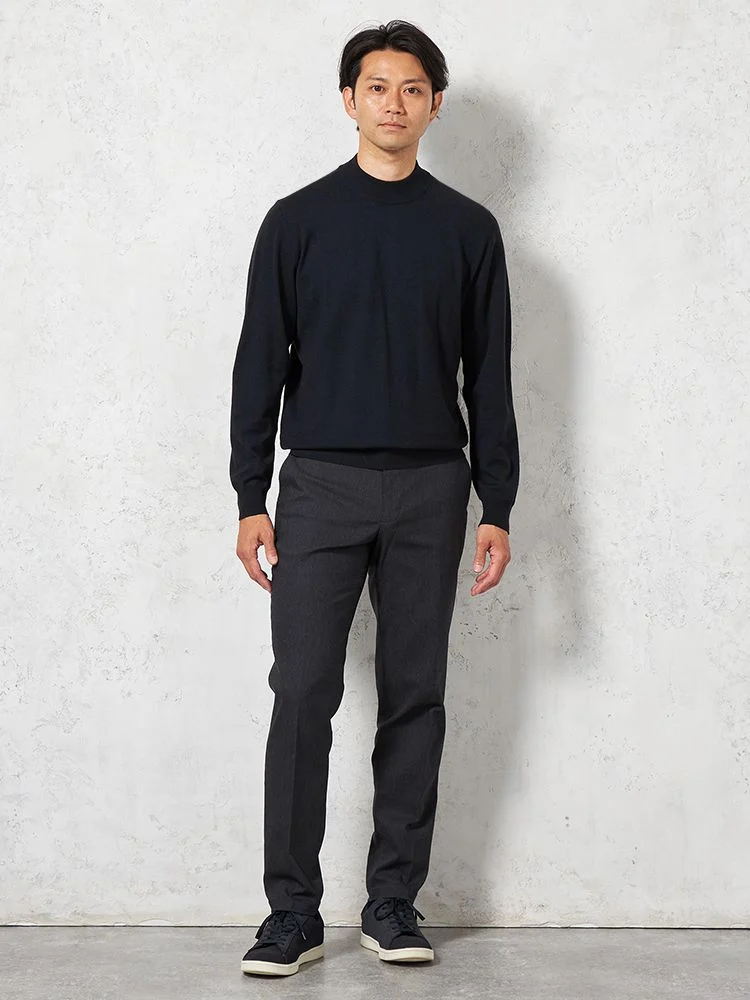 やや詰まりのあるモックネックでカジュアルになりすぎない、こなれ感のある装いが完成します。