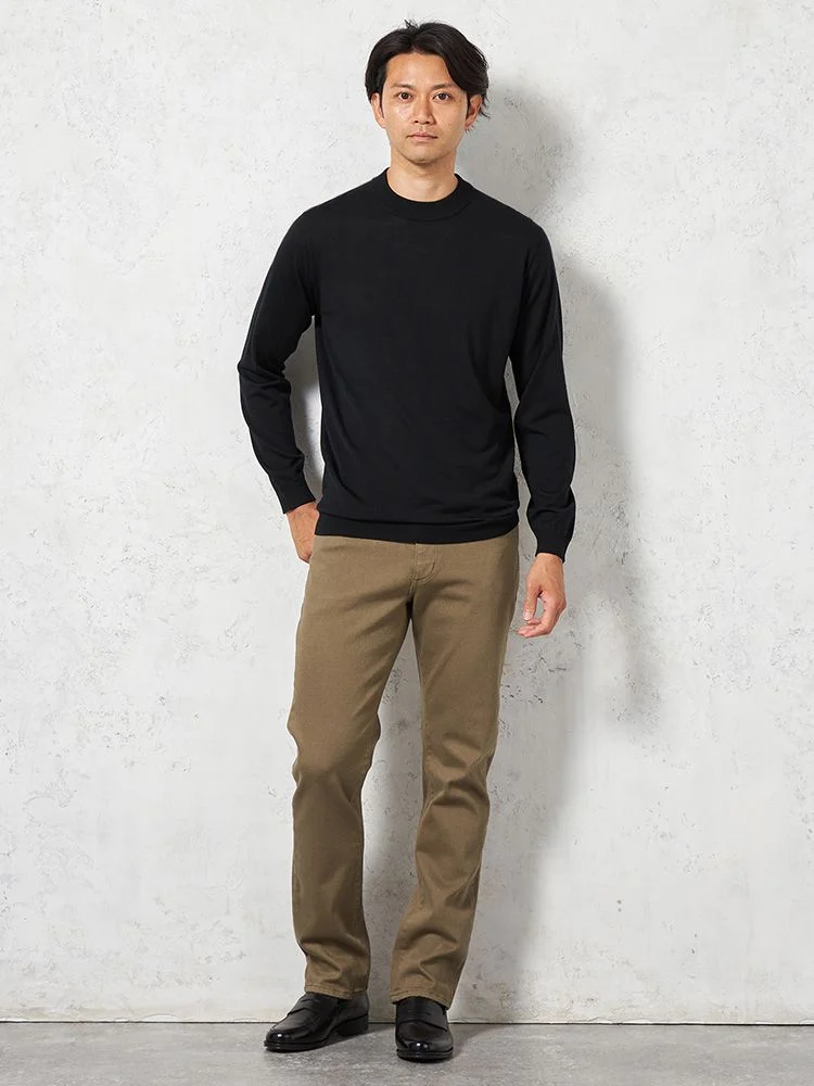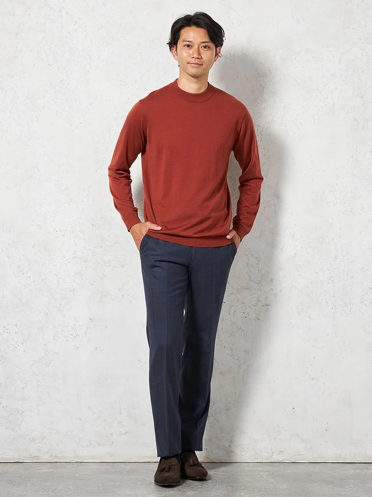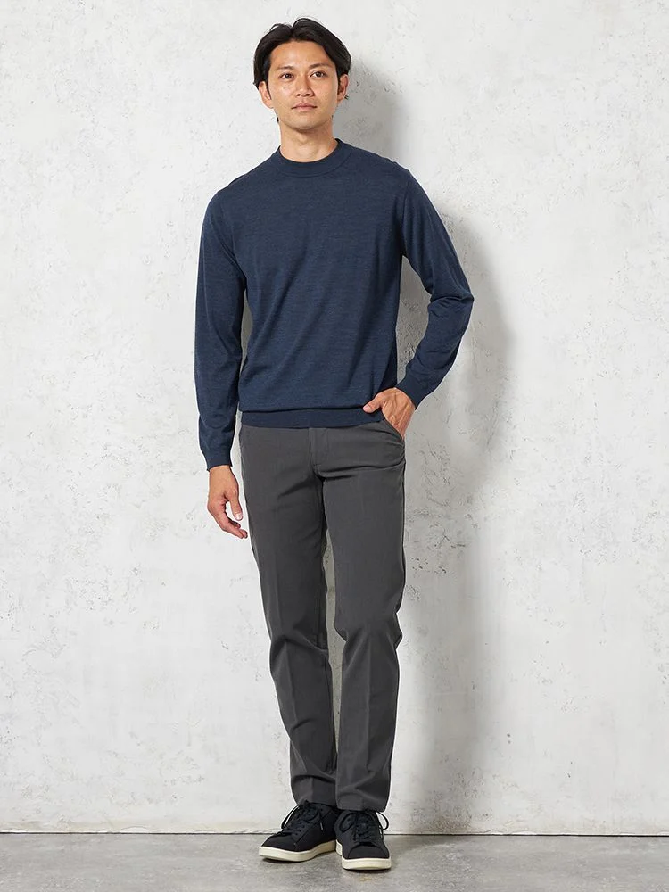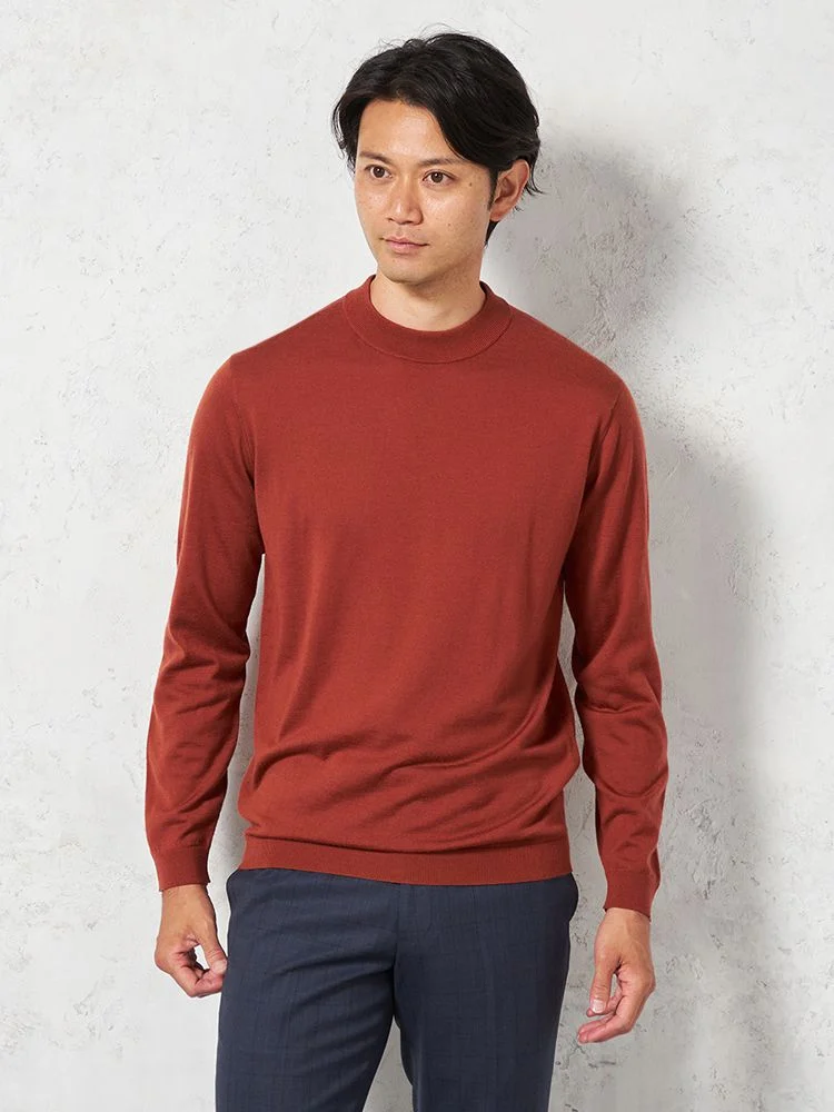 ビジネスにもぴったりなモックネックと、無地ベースで他のアイテムとも合わせやすくなっています。
