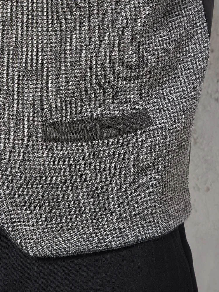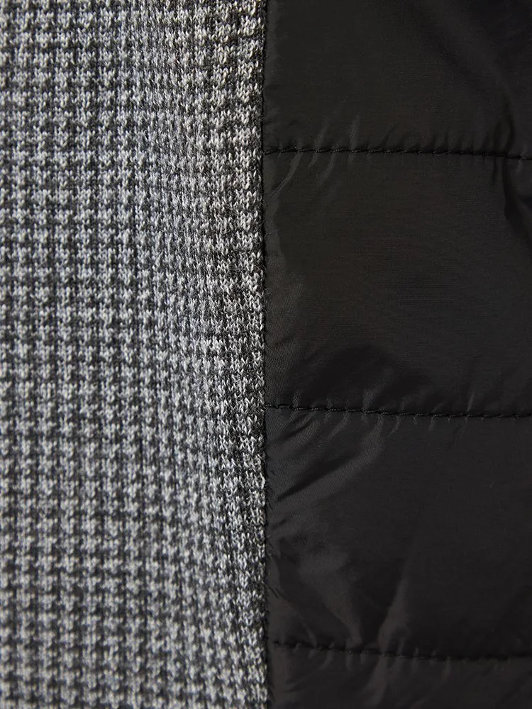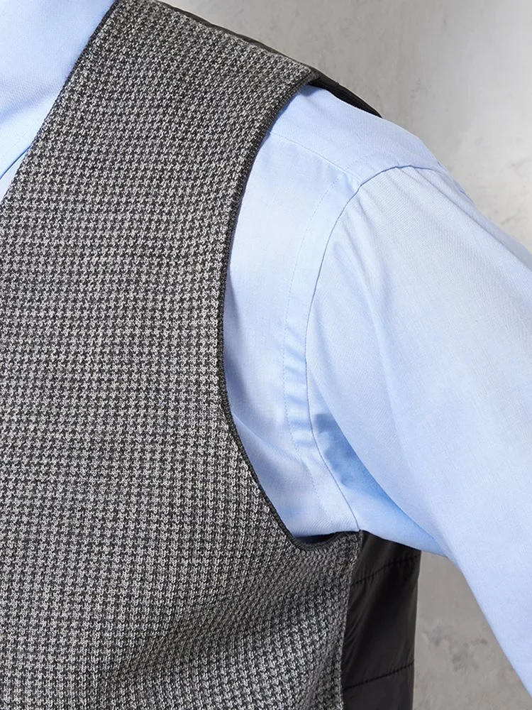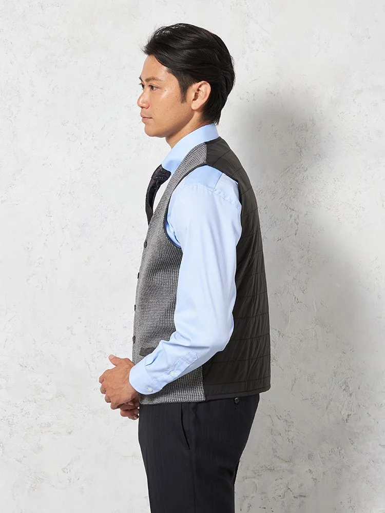 前身頃はクラシカルな千鳥格子柄、後ろ身頃はカジュアルなキルティングと、異なるスタイルを組み合わせた個性的なデザインに。