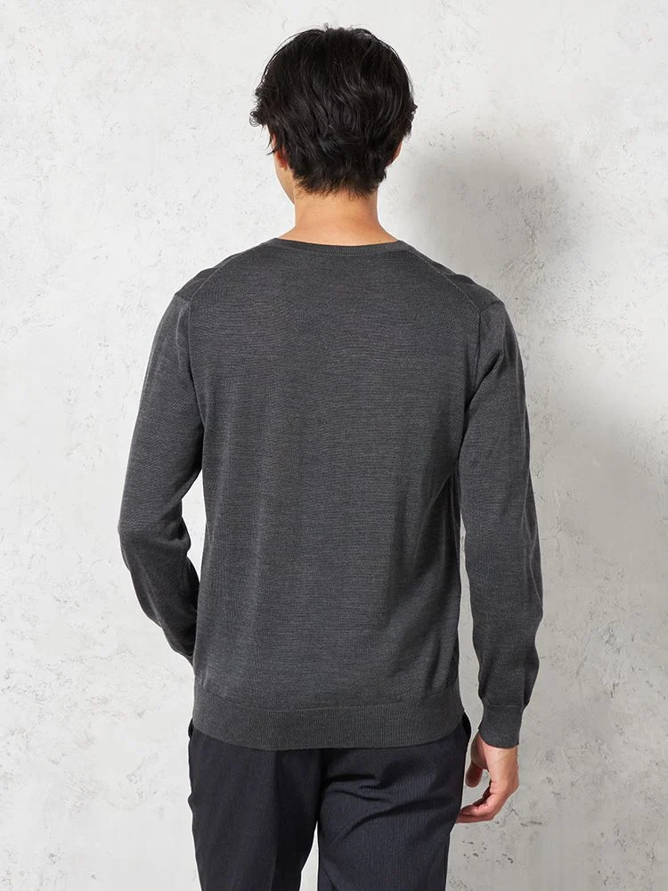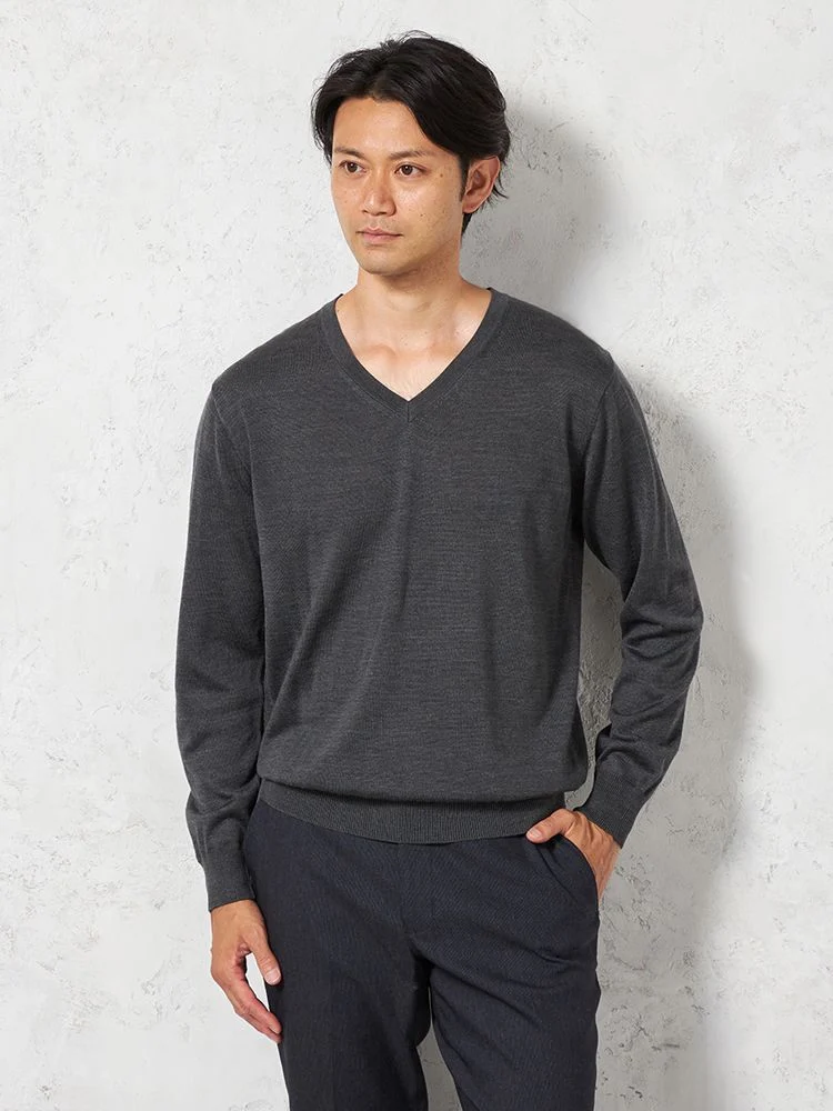 【ウォッシャブル】ニットVネックセーター放電抗ピリング無地天竺長袖リッケンバッカー秋冬