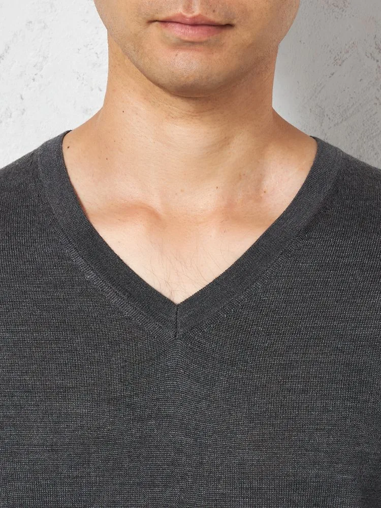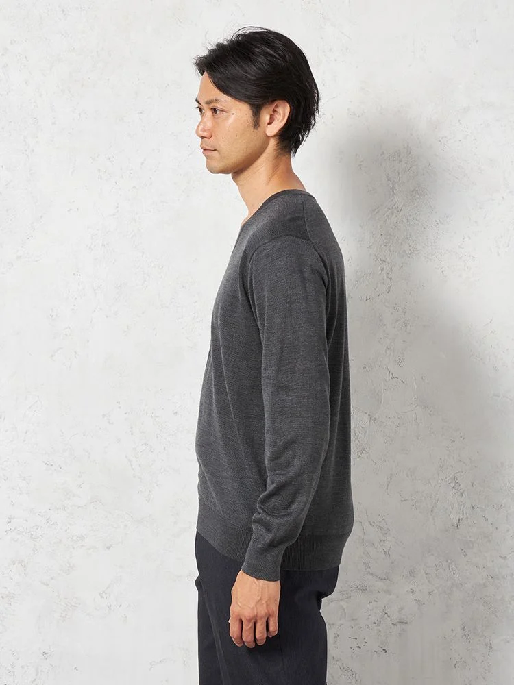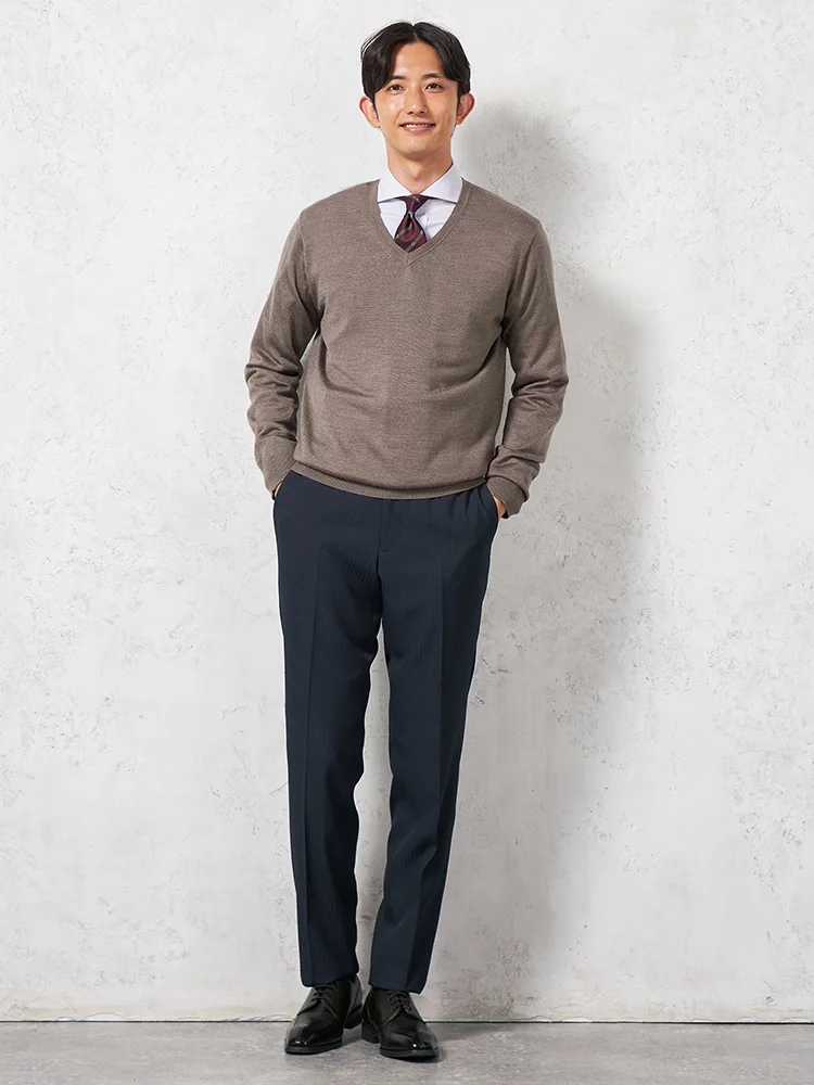 首元は顔まわりをすっきりと見せてくれるVネックを採用し、スタイリッシュな1枚に仕上げました。