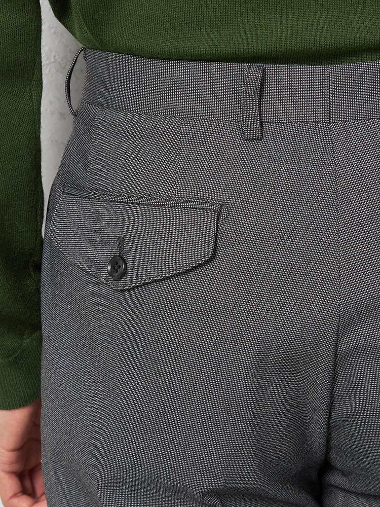 パンツの腰回りに生地の折り込みがなく、スッキリとしたシルエットを実現します。シンプルで洗練された印象を与え、すっきりとした着こなしが可能です。