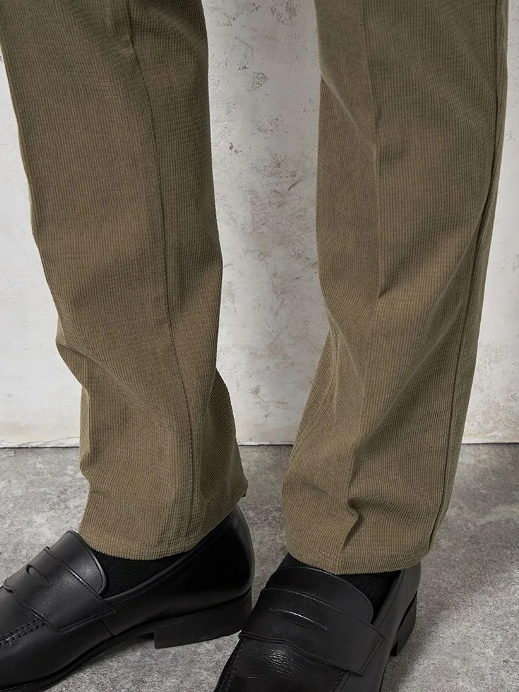 パンツの腰回りに生地の折り込みがなく、スッキリとしたシルエットを実現します。シンプルで洗練された印象を与え、すっきりとした着こなしが可能です。