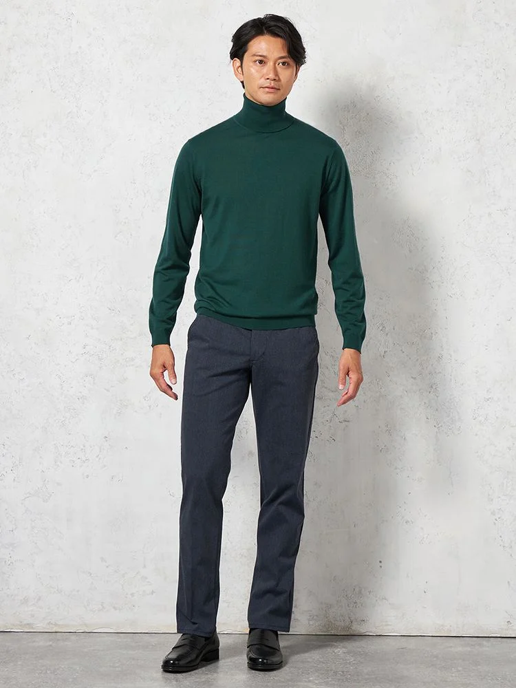 パンツの腰回りに生地の折り込みがなく、スッキリとしたシルエットを実現します。シンプルで洗練された印象を与え、すっきりとした着こなしが可能です。