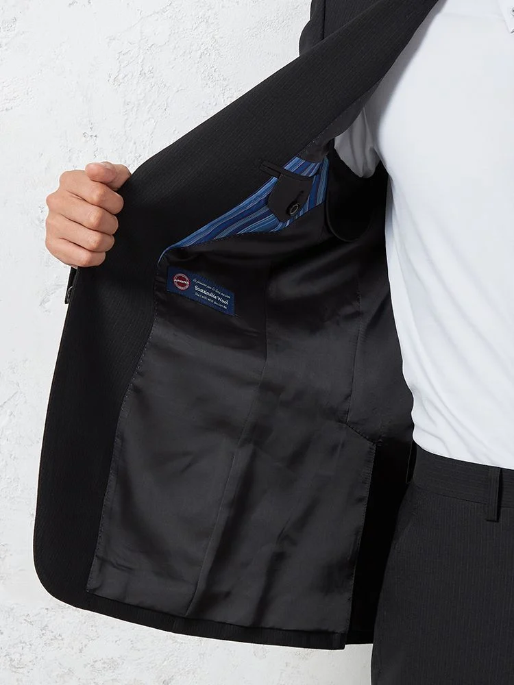 サスティナブルウール素材を使用し、環境にも配慮したツーピーススーツ。