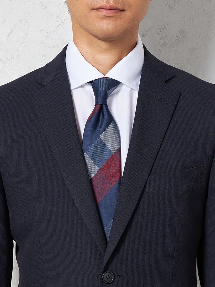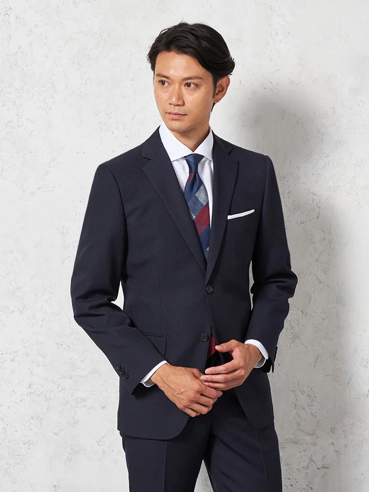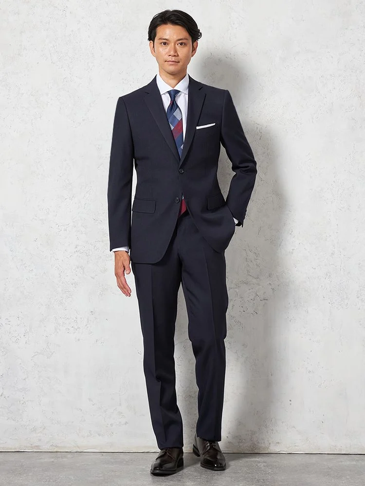 あわせるシャツやネクタイなどの小物を選ばない定番のシンプルなデザインで着まわし度は抜群です。