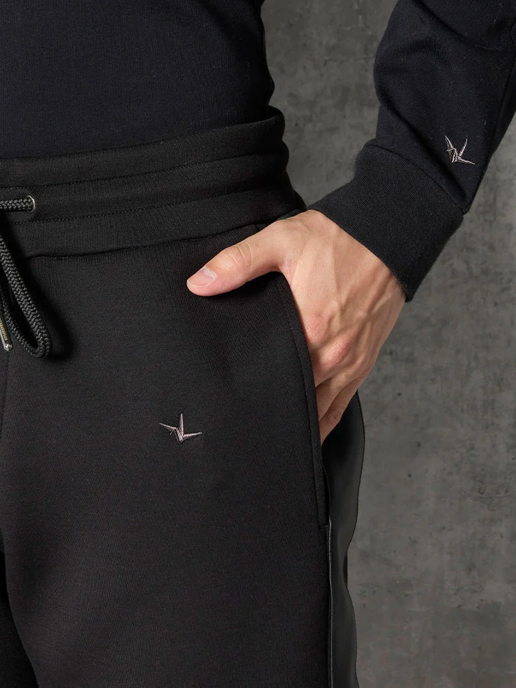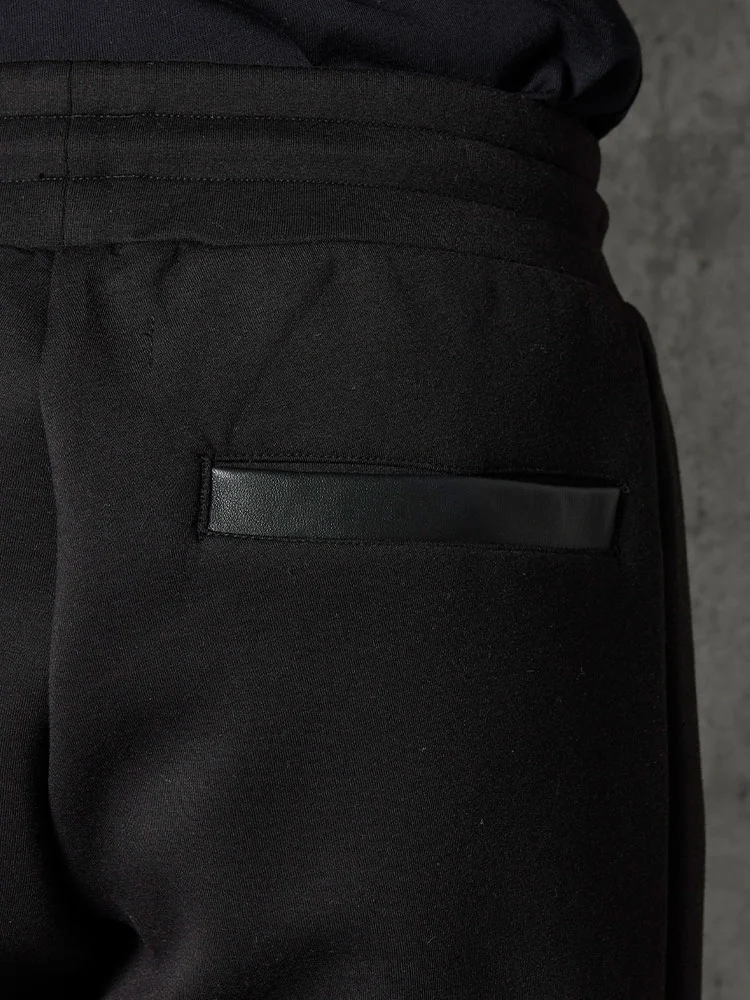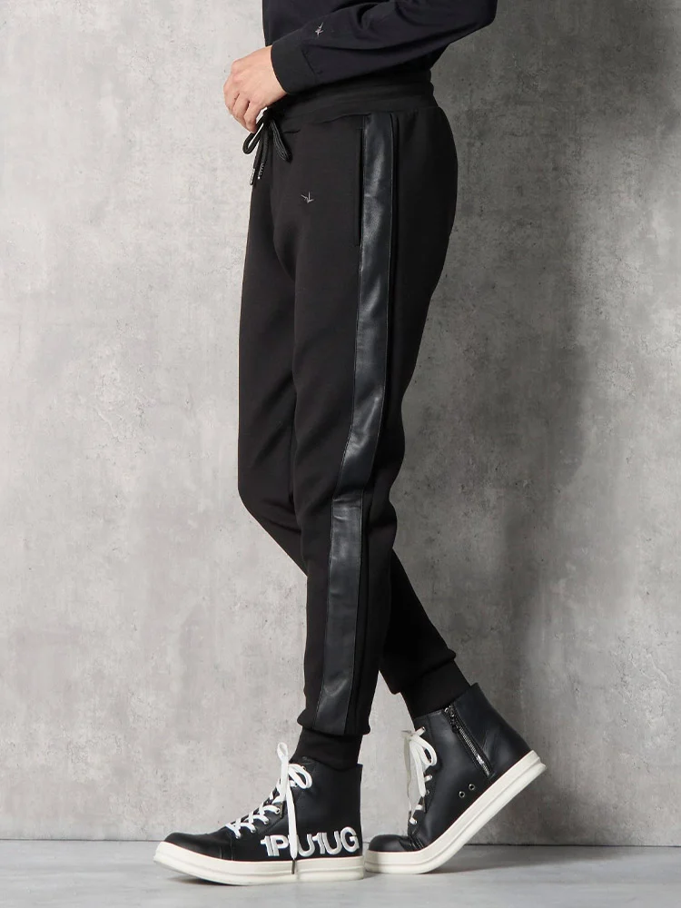 レザーxポンチの異素材コンビのロングパンツ。