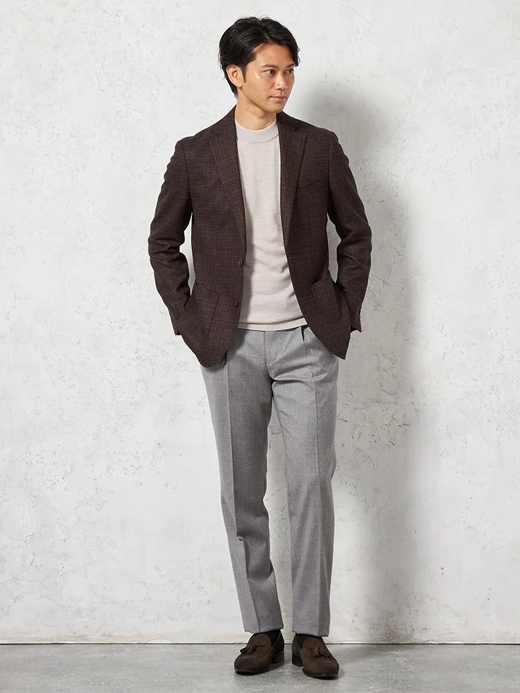 2つボタンのデザインで、クラシックなスタイルを演出。落ち着きと品のあるアイテムです。