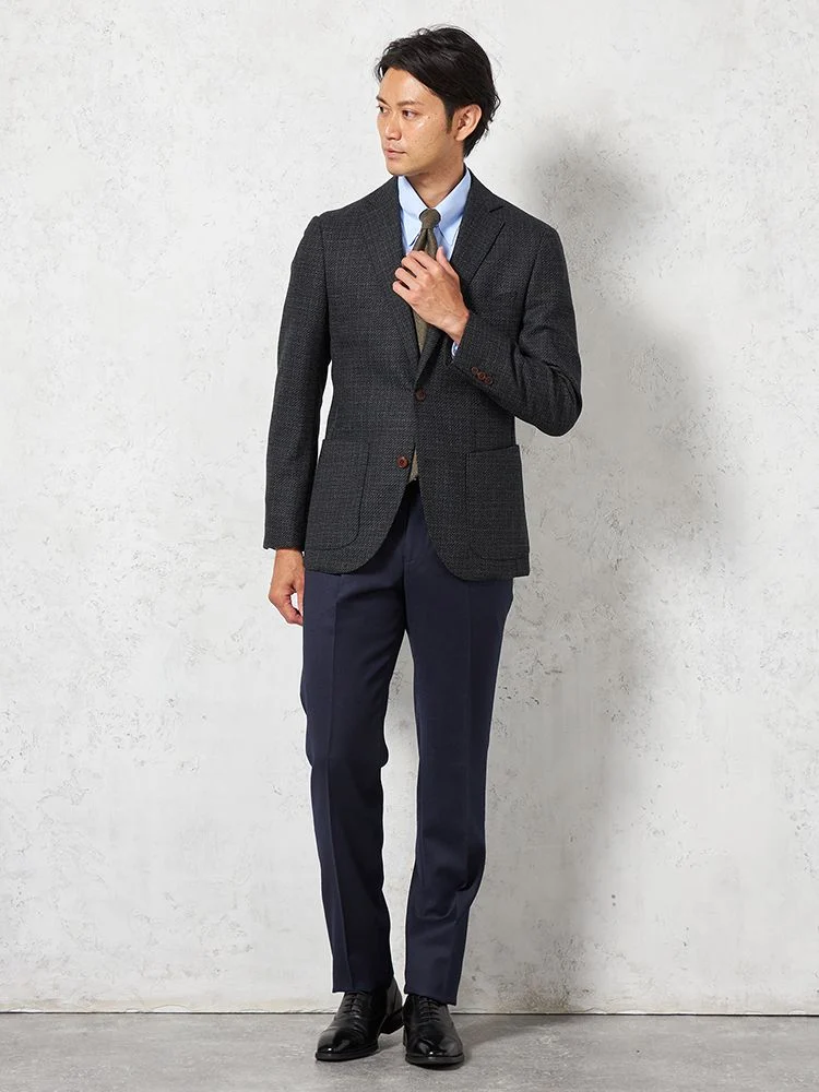2つボタンのデザインで、クラシックなスタイルを演出。落ち着きと品のあるアイテムです。