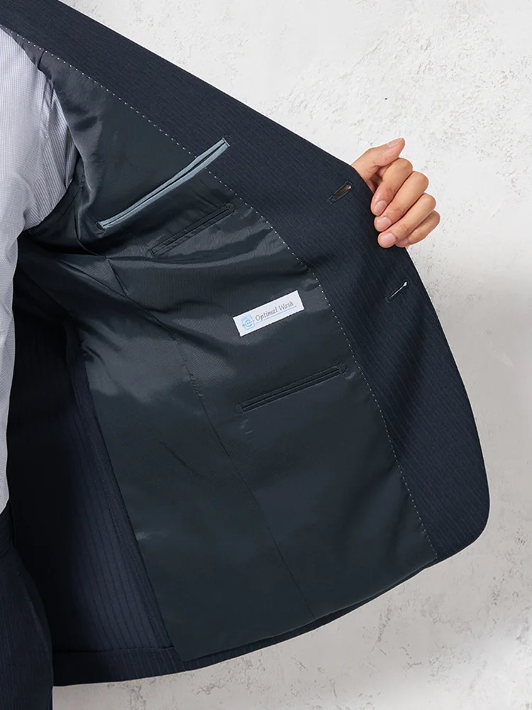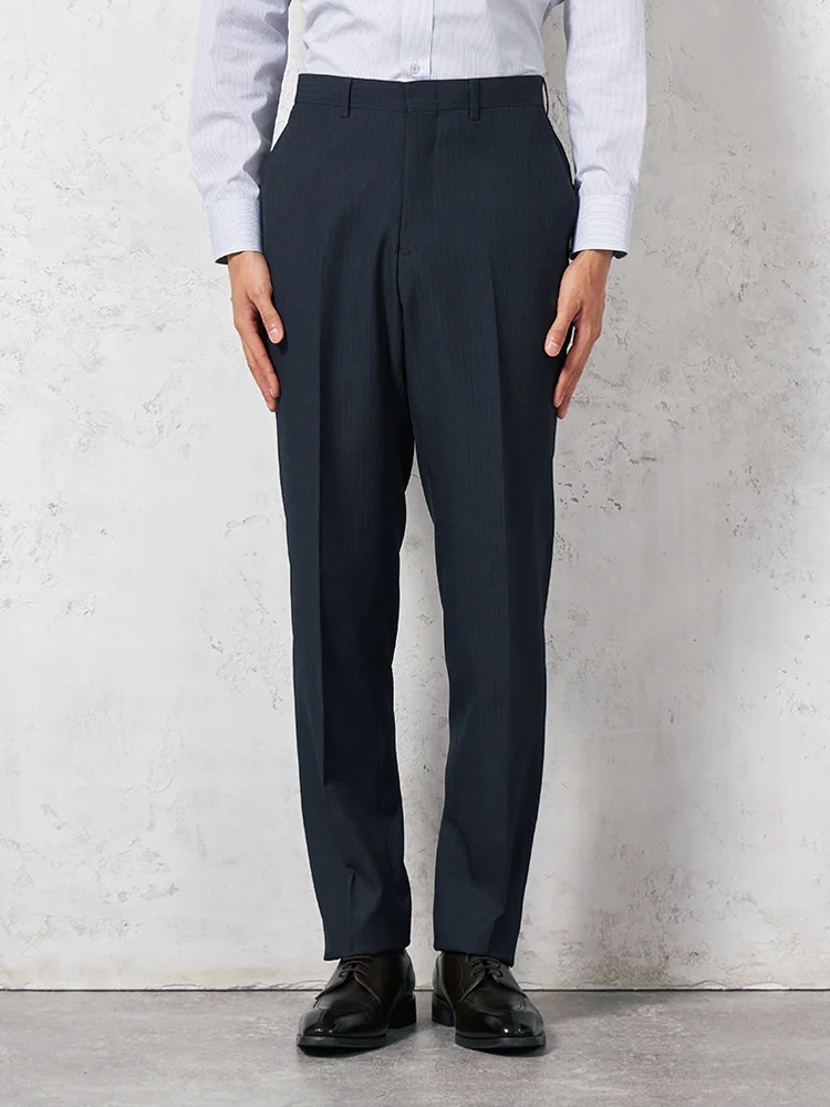 丈夫でしわになりにくいポリエステル100%素材を使用したツーパンツスーツ。