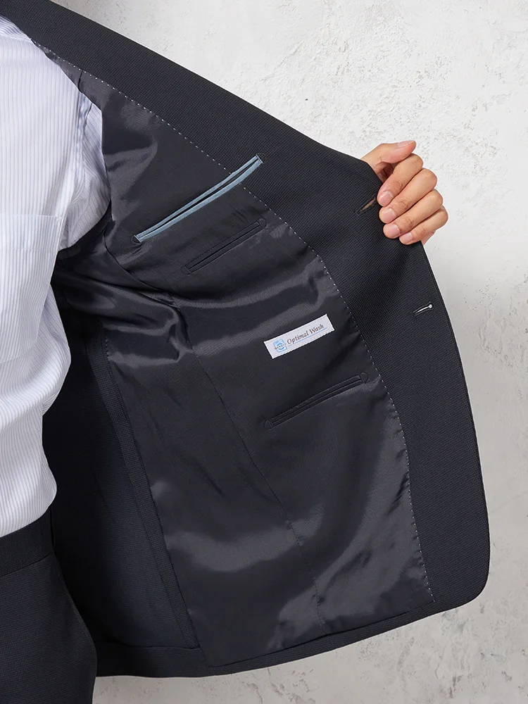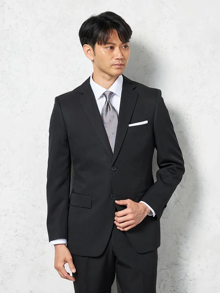 丈夫でしわになりにくいポリエステル100%素材を使用したツーピーススーツ。