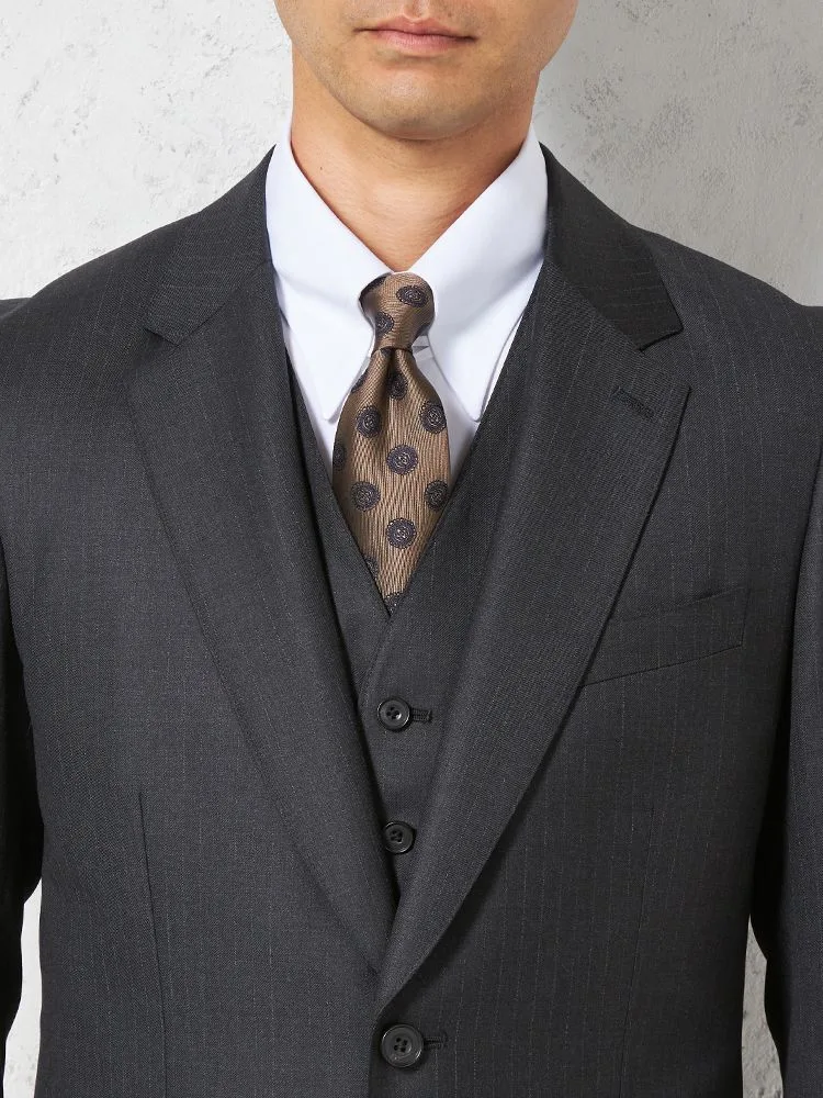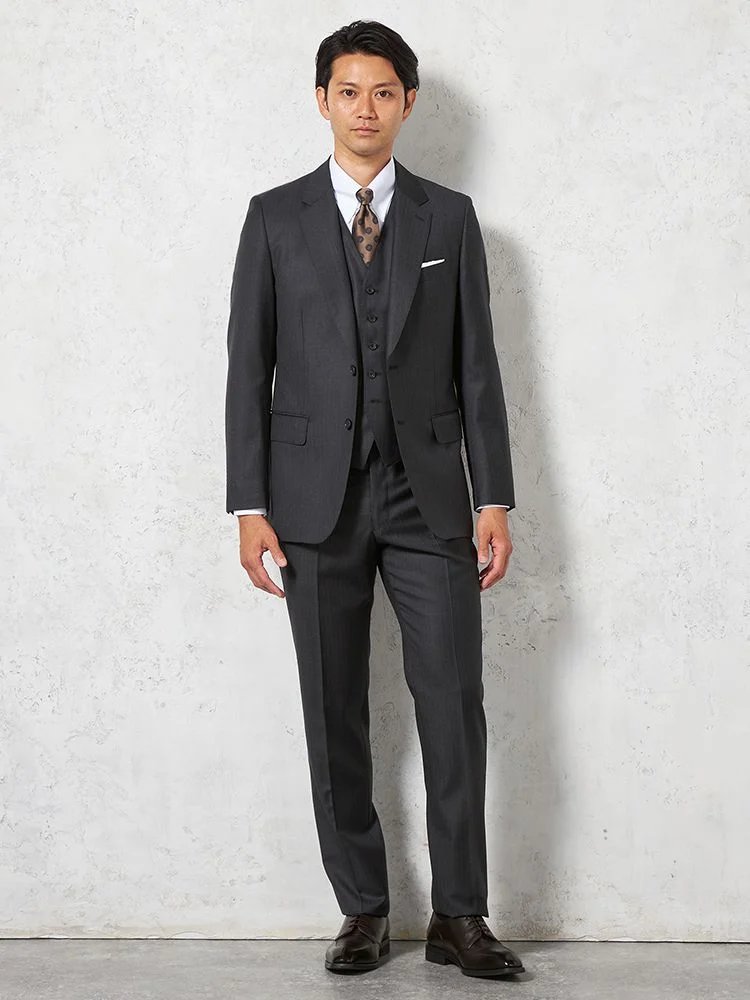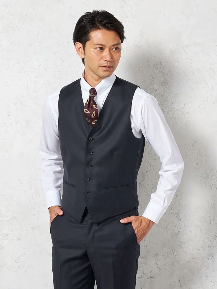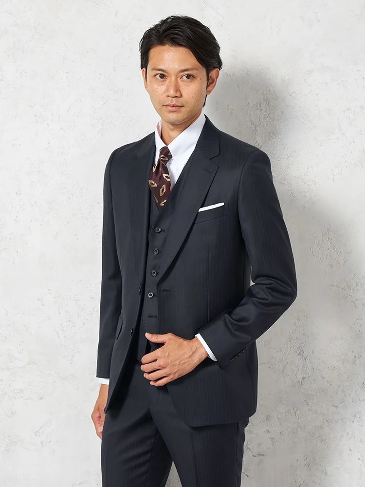 光沢感あるトレンドカラーを採用したスリーピーススーツです。