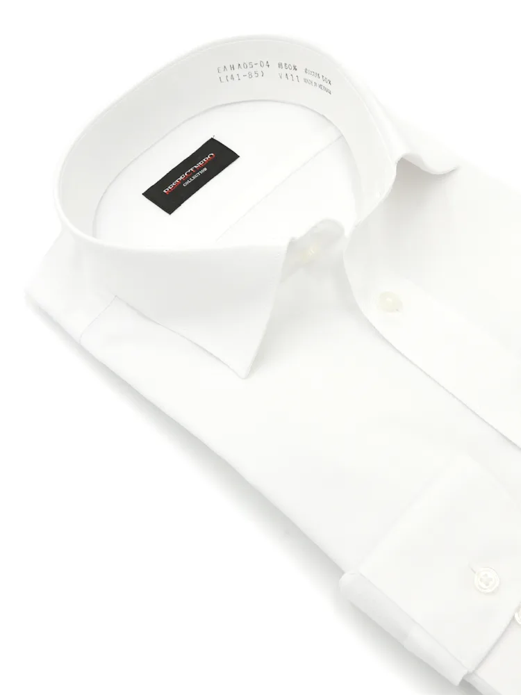ビジネスシーンに重宝するシンプルデザインとスタンダードな襟型のセミワイドカラ―シャツ。