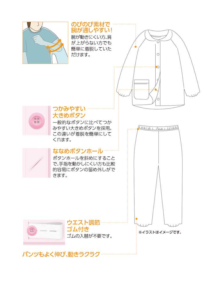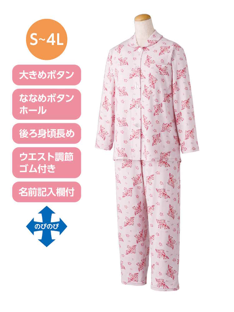【前開き】【年間素材】大きめボタンのびのびストレッチパジャマ4/婦人用/レディース/高齢者/シニア/斜めボタンホール/名前記入欄付/後ろ長め/ギフト/プレゼント 【CF】(ピンク)