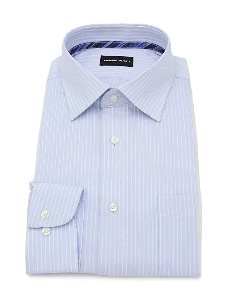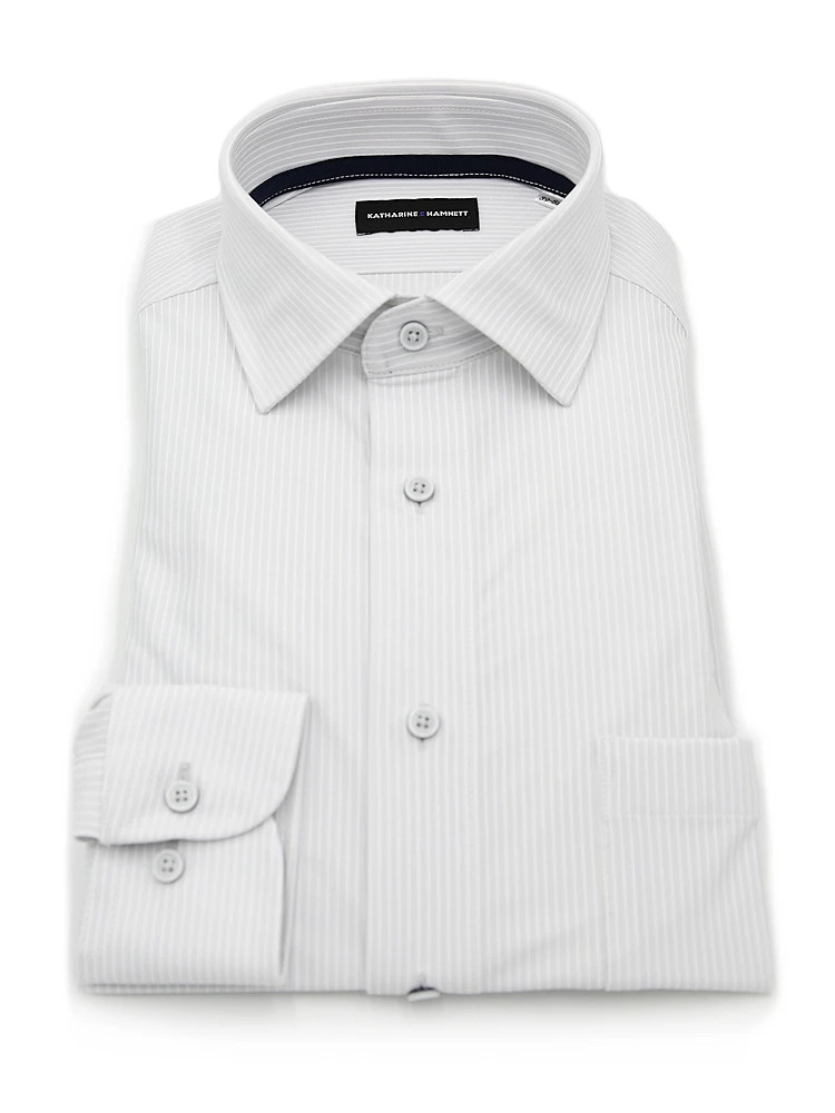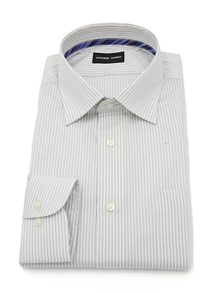 【KATHARINEEHAMNETT-キャサリン・イー・ハムネット-】長袖ワイシャツセミワイドグレーストライプ柄リサイクル素材使用通年