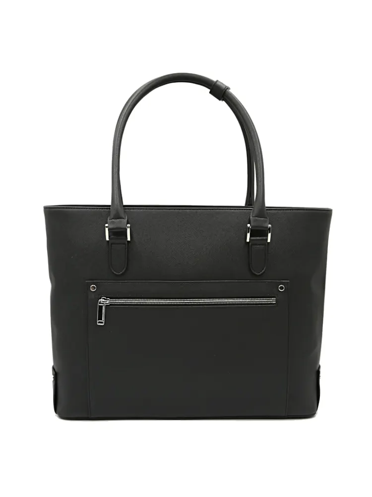 サフィアーノ調の型押し合成皮革に、前面のメタルファスナーポケットがアクセントになり、シャープでスマートな印象です。