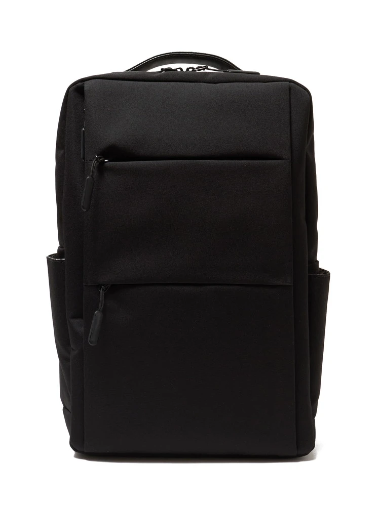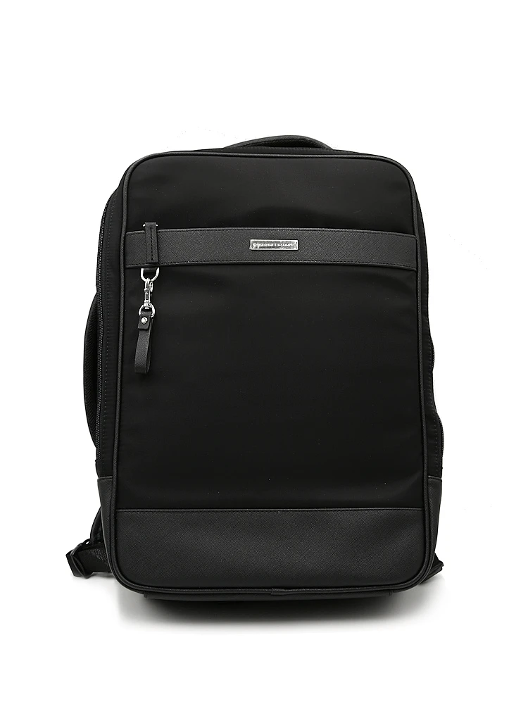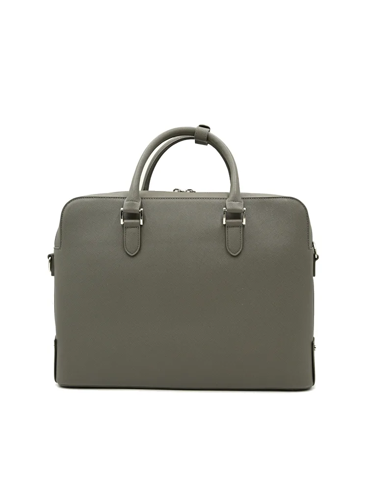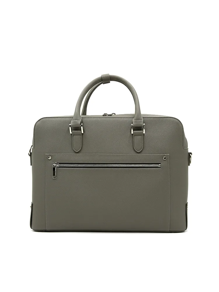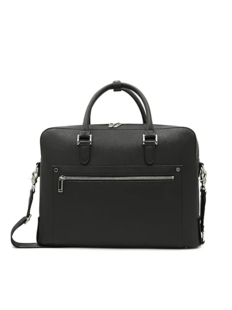 サフィアーノ調型押しの合成皮革に、前面のメタルファスナーポケットがアクセントになりシャープでスマートな印象。