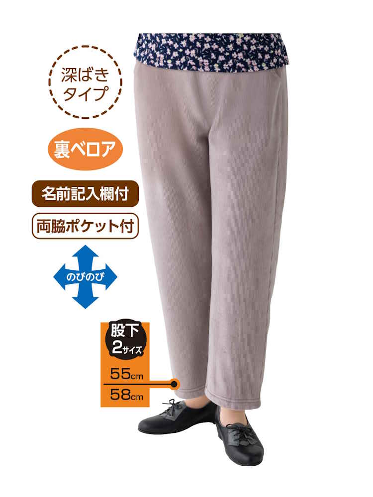 【秋冬】【深履き】あったか裏ベロアフリーパンツ股下58?/婦人用/レディース/高齢者/シニア/名前記入欄付/両脇ポケット/部屋着/お出かけ/ギフト/プレゼント【CF】