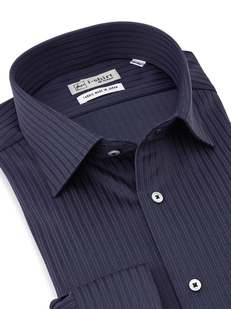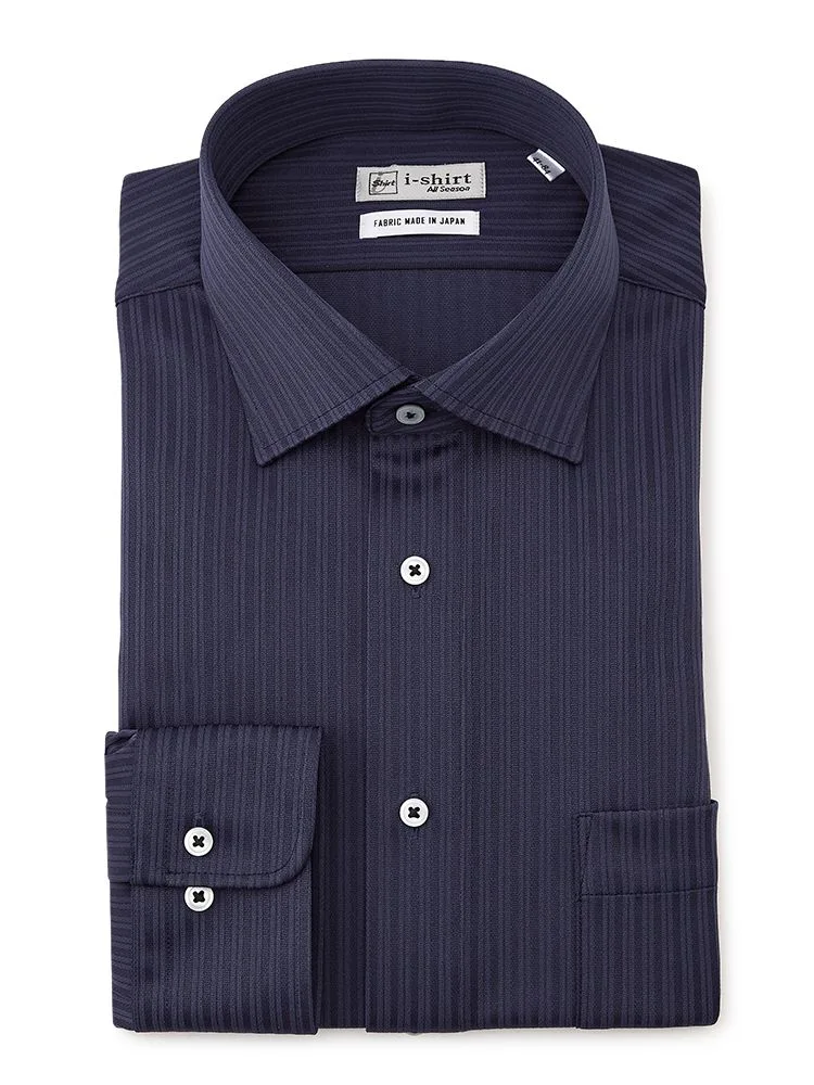 【形態安定】アイシャツ 長袖ワイシャツ ワイド ストライプ i-shirt 通年(ネイビー)