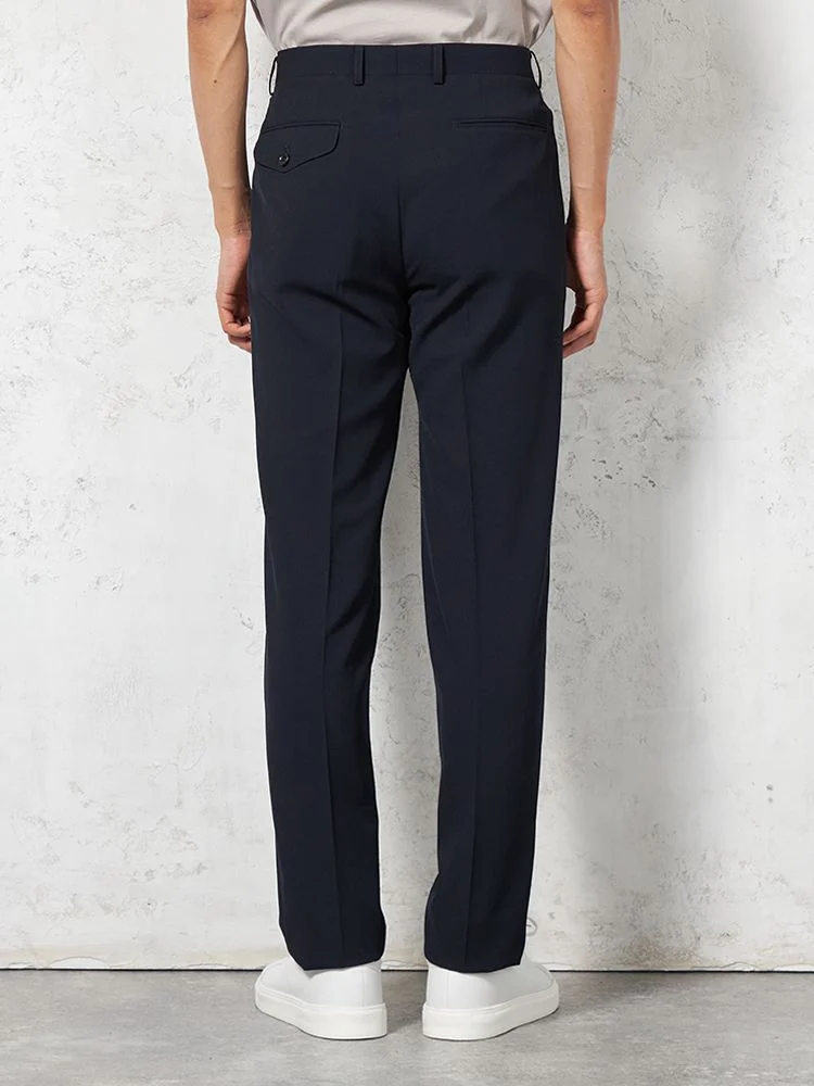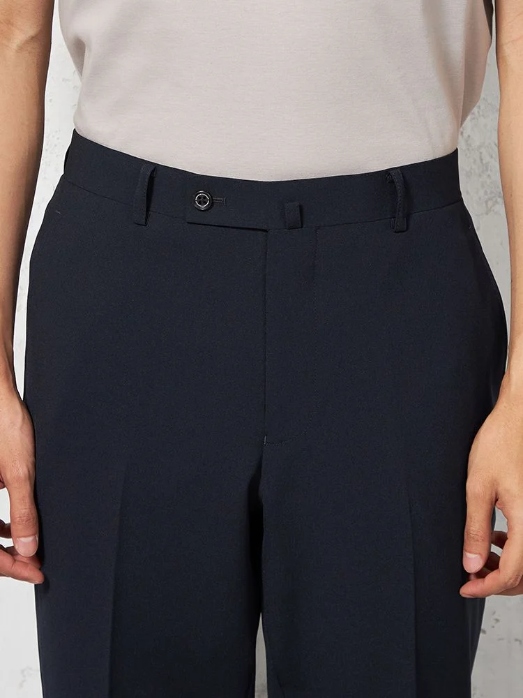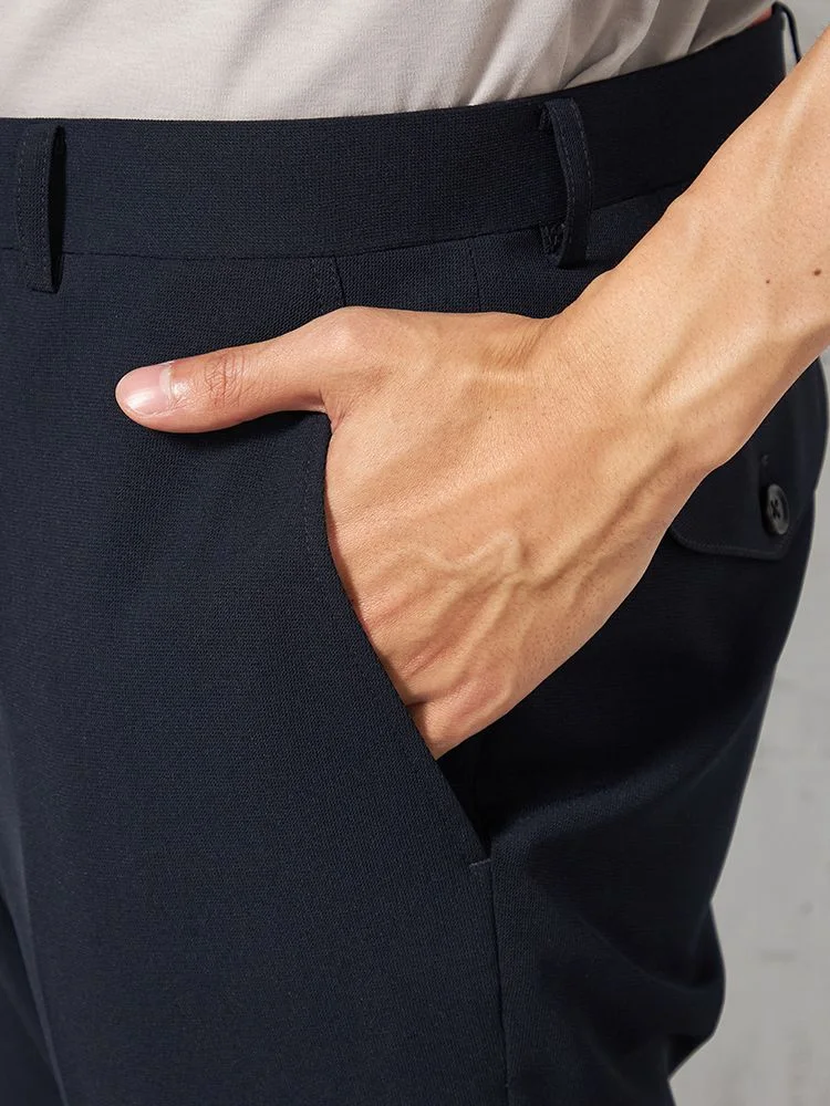 パンツの腰回りに生地の折り込みがなく、スッキリとしたシルエットを実現します。シンプルで洗練された印象を与え、すっきりとした着こなしが可能です。