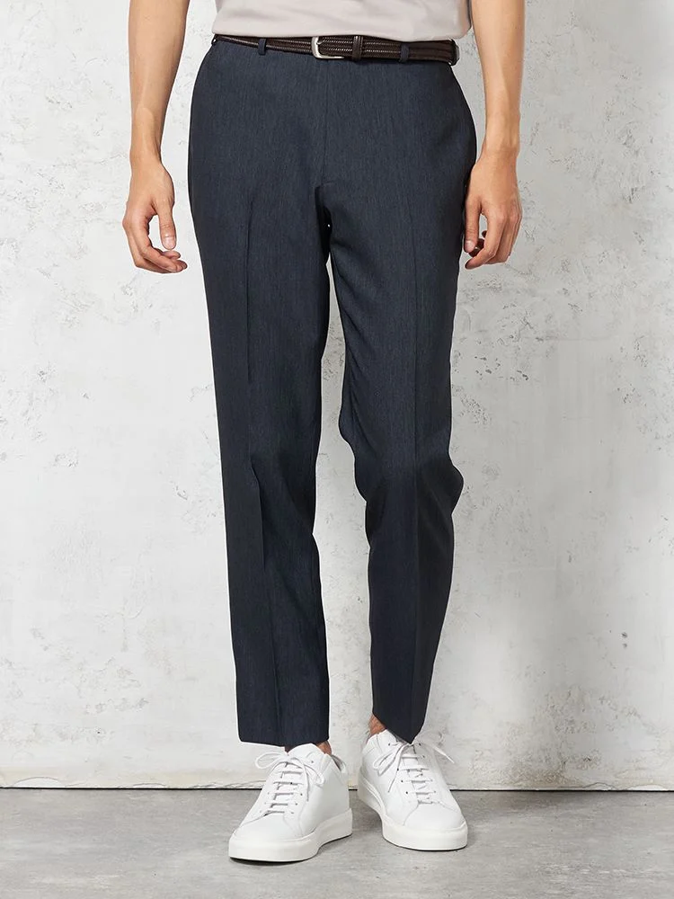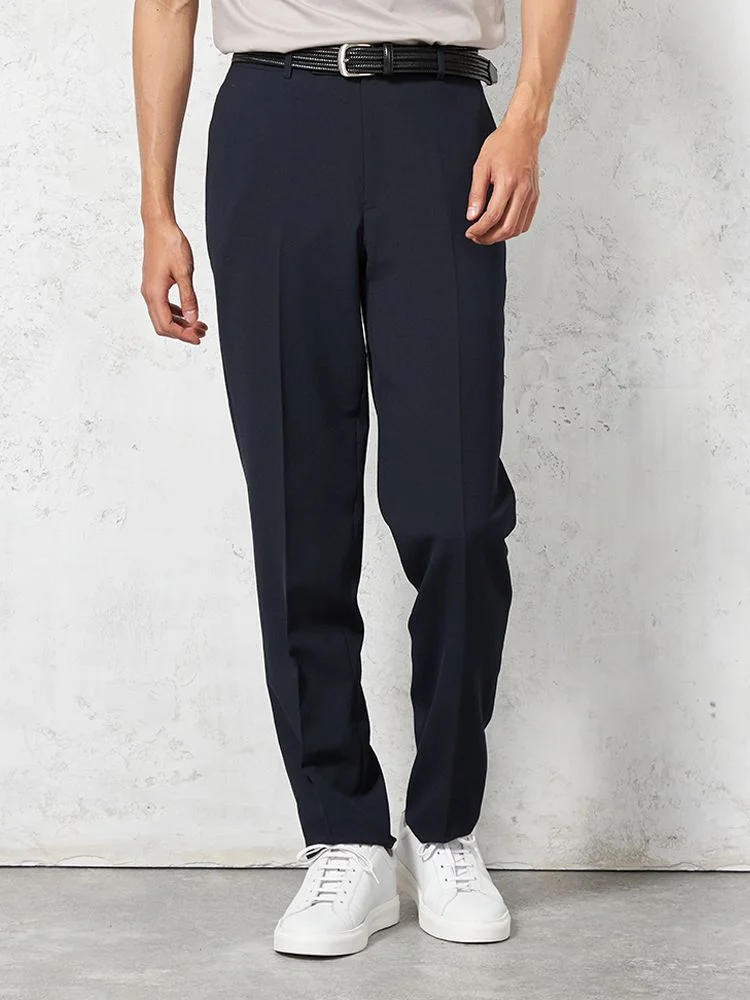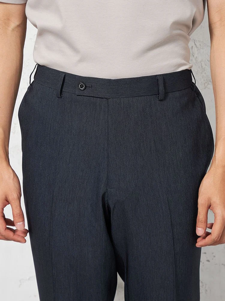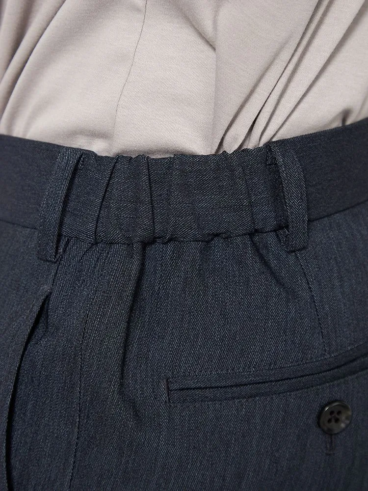 パンツの腰回りに生地の折り込みがなく、スッキリとしたシルエットを実現します。シンプルで洗練された印象を与え、すっきりとした着こなしが可能です。