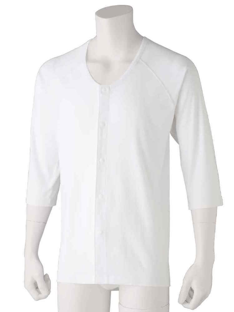 【前開き】【あったか】8分袖発熱ワンタッチシャツ/紳士用/メンズ/高齢者/シニア/秋冬/洗濯機OK/名前記入欄付/後ろ長め【CF】