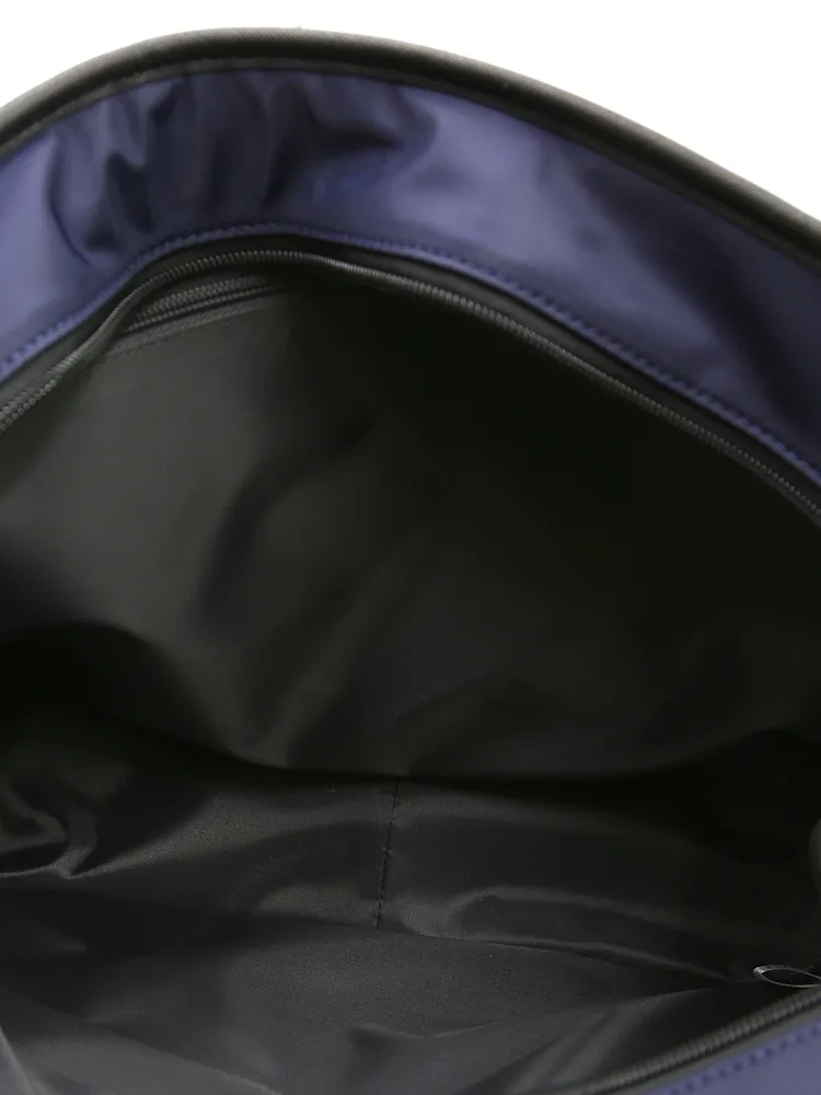 アクセントとなる前面のメタルファスナーポケットはマチ付きで内生地が防水ビニールなので、濡れた折りたたみ傘などの収納に便利です。