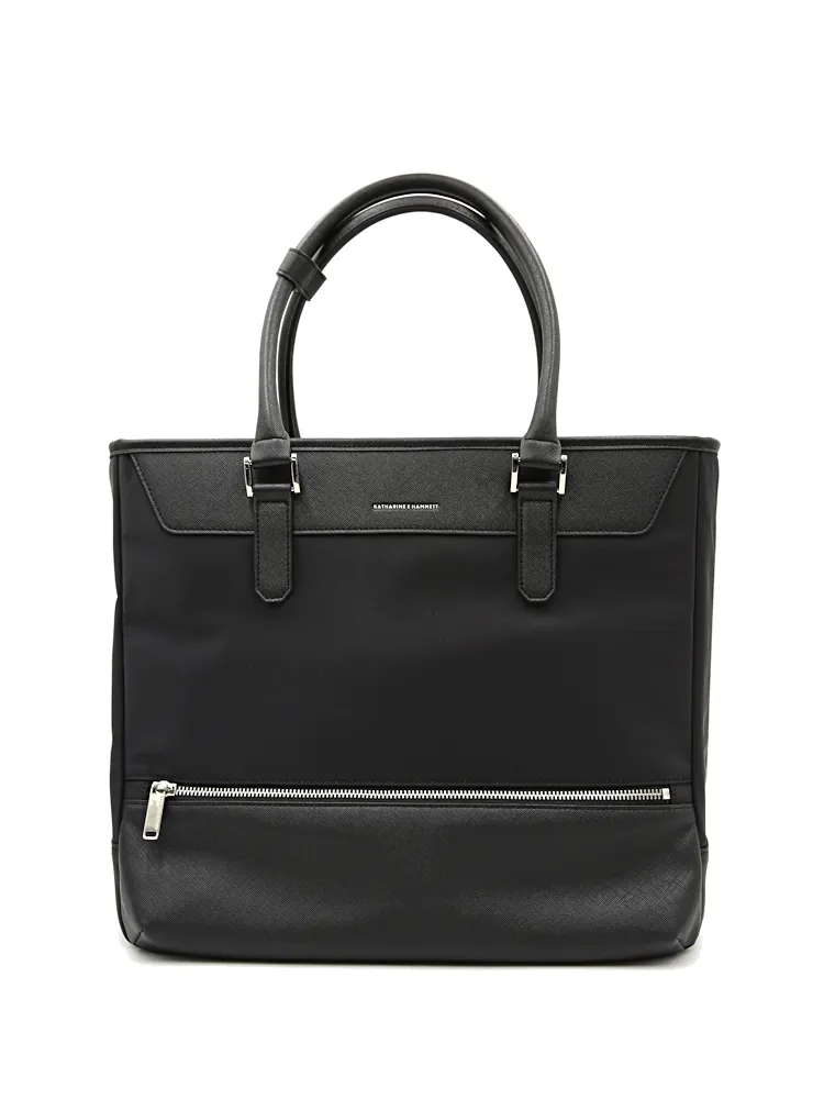 【KATHARINEEHAMNETT-キャサリン・イー・ハムネット-】トートバックナイロン×サフィアーノ調多収納無地通年
