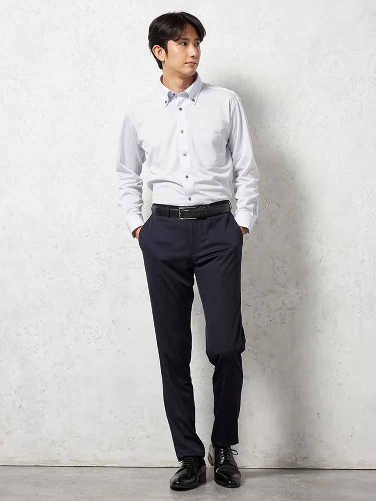 シャープなシルエットが魅力のスリムタイプながら、ストレッチ性のあるニット素材を使用しているため窮屈感なく着用いただけます。