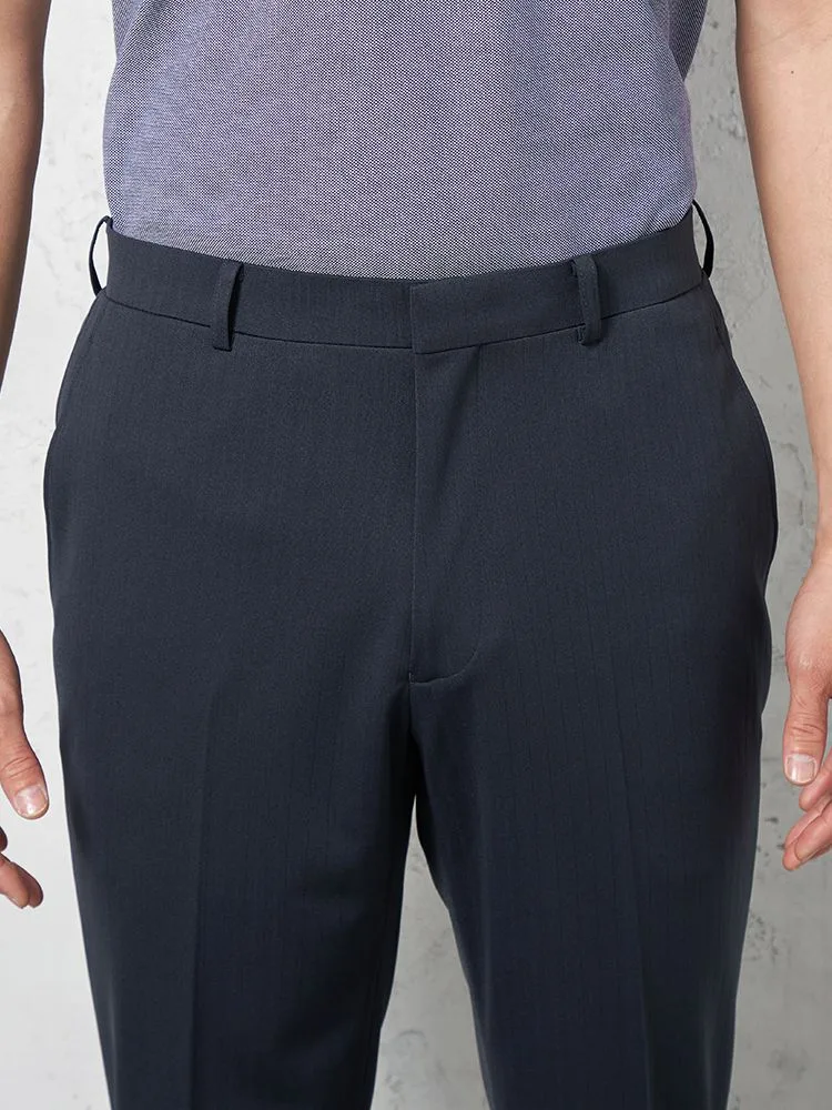 パンツの腰回りに生地の折り込みがなく、スッキリとしたシルエットを実現します。シンプルで洗練された印象を与え、すっきりとした着こなしが可能です。