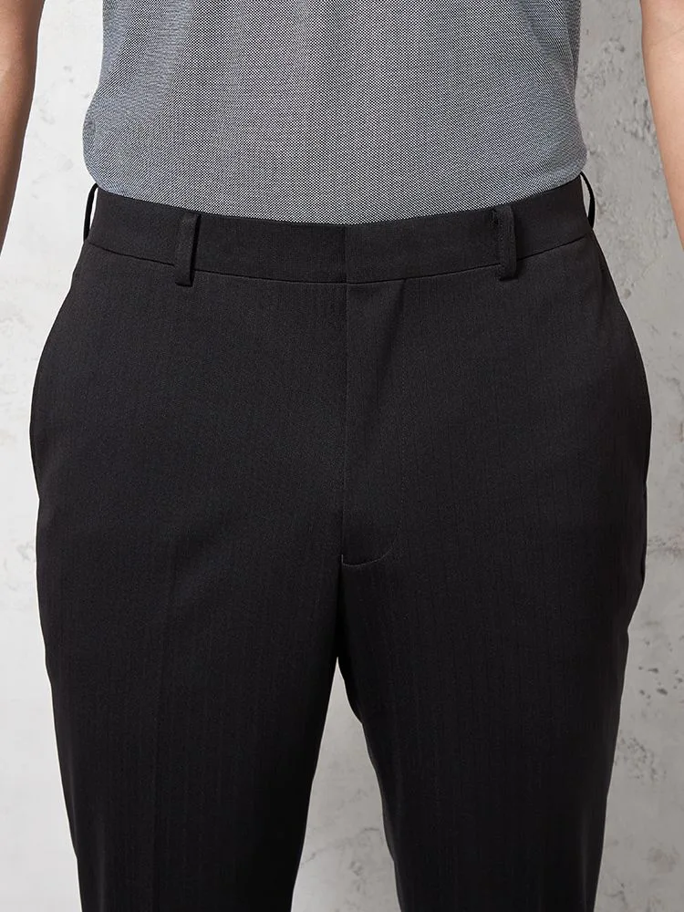 パンツの腰回りに生地の折り込みがなく、スッキリとしたシルエットを実現します。シンプルで洗練された印象を与え、すっきりとした着こなしが可能です。