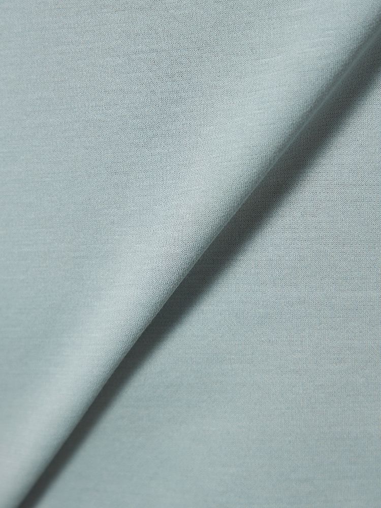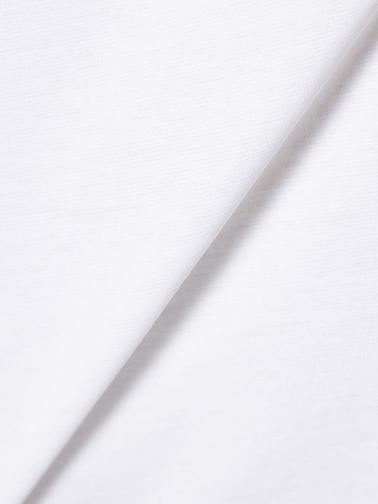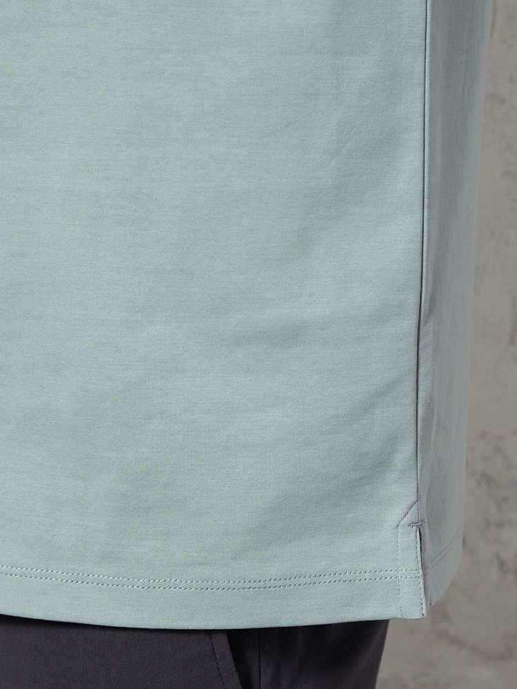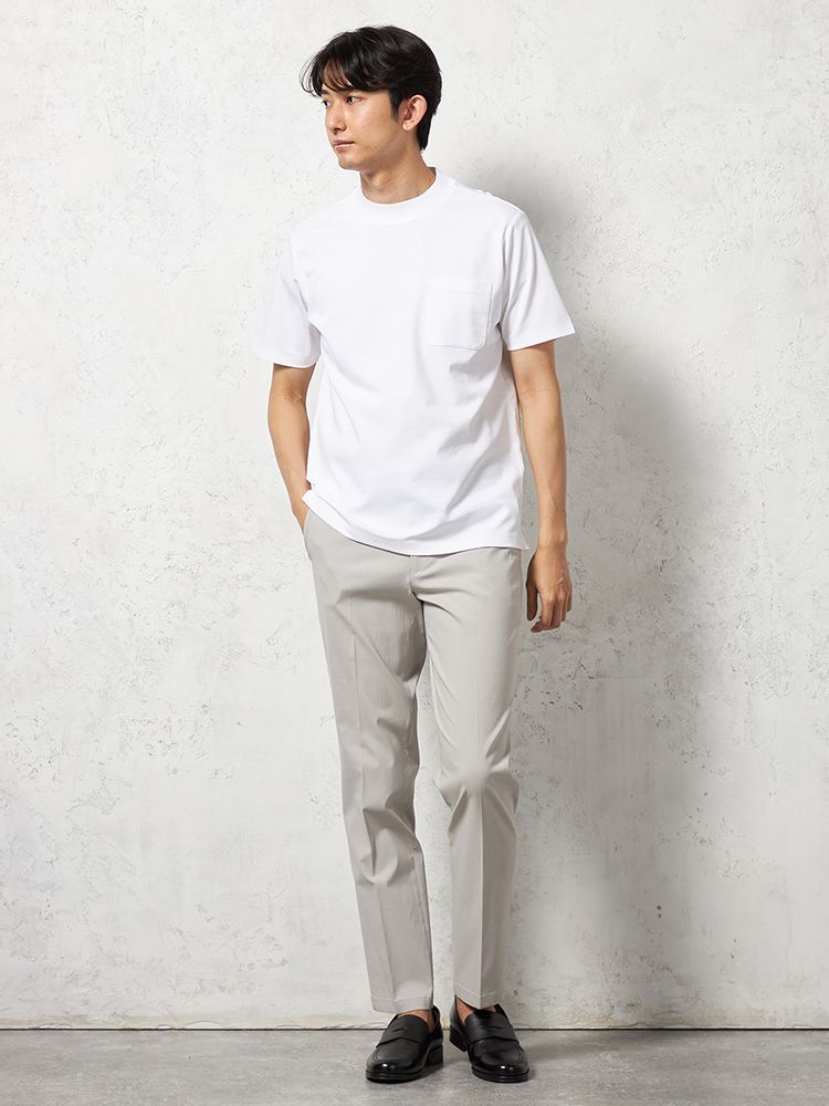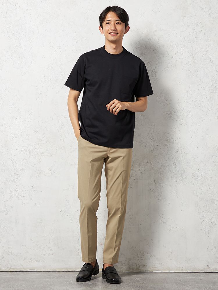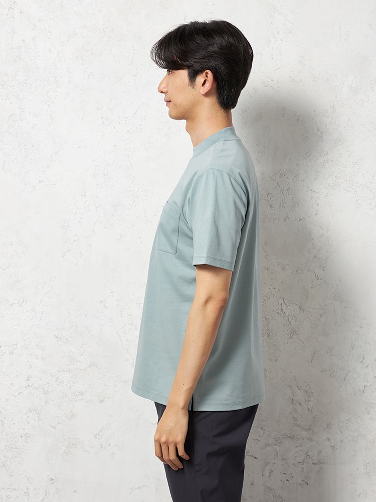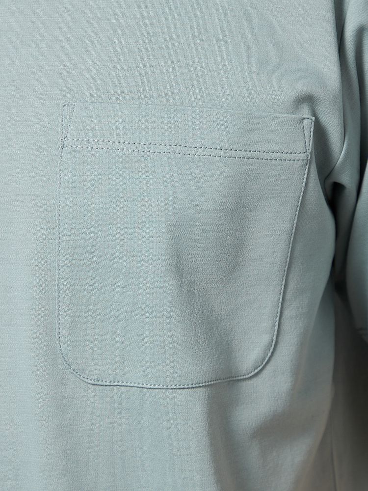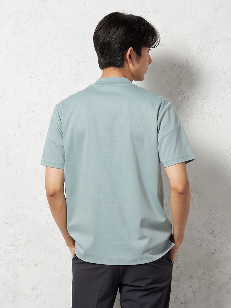 コットン100%で優しい肌触りでありながら、膨らみがあり適度なハリコシがあるダブルジャージ構造と、シルケット加工で生地表面に光沢を出したことにより、キレイ目な仕上がりを実現。