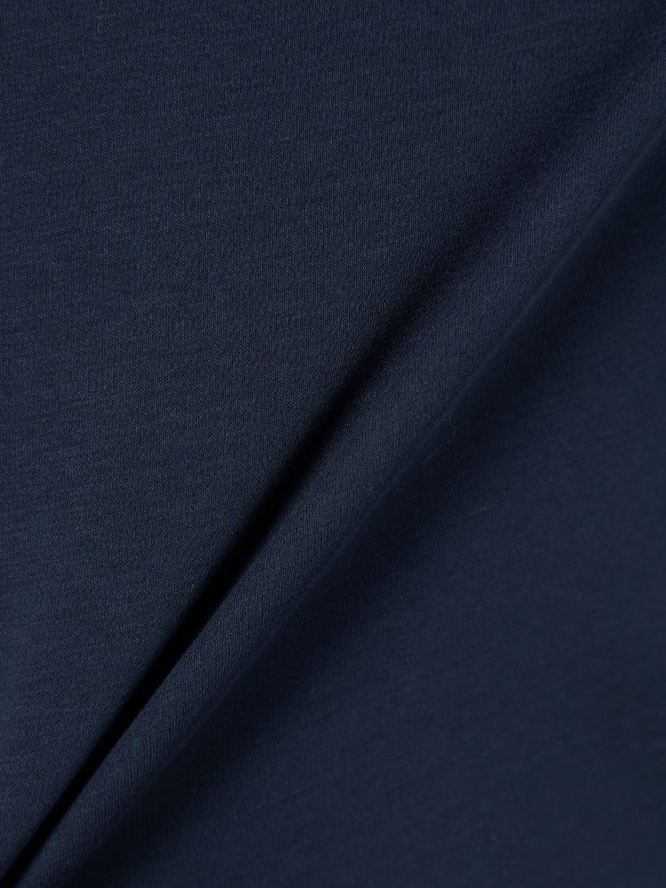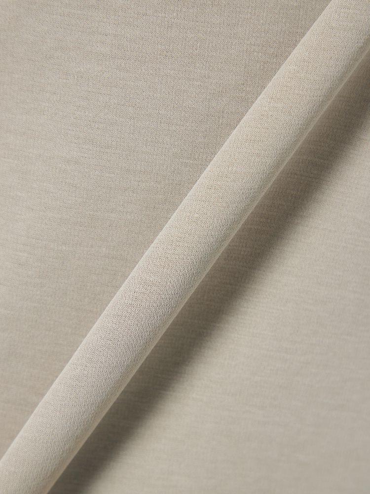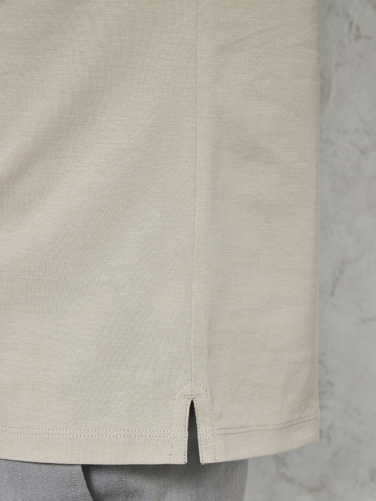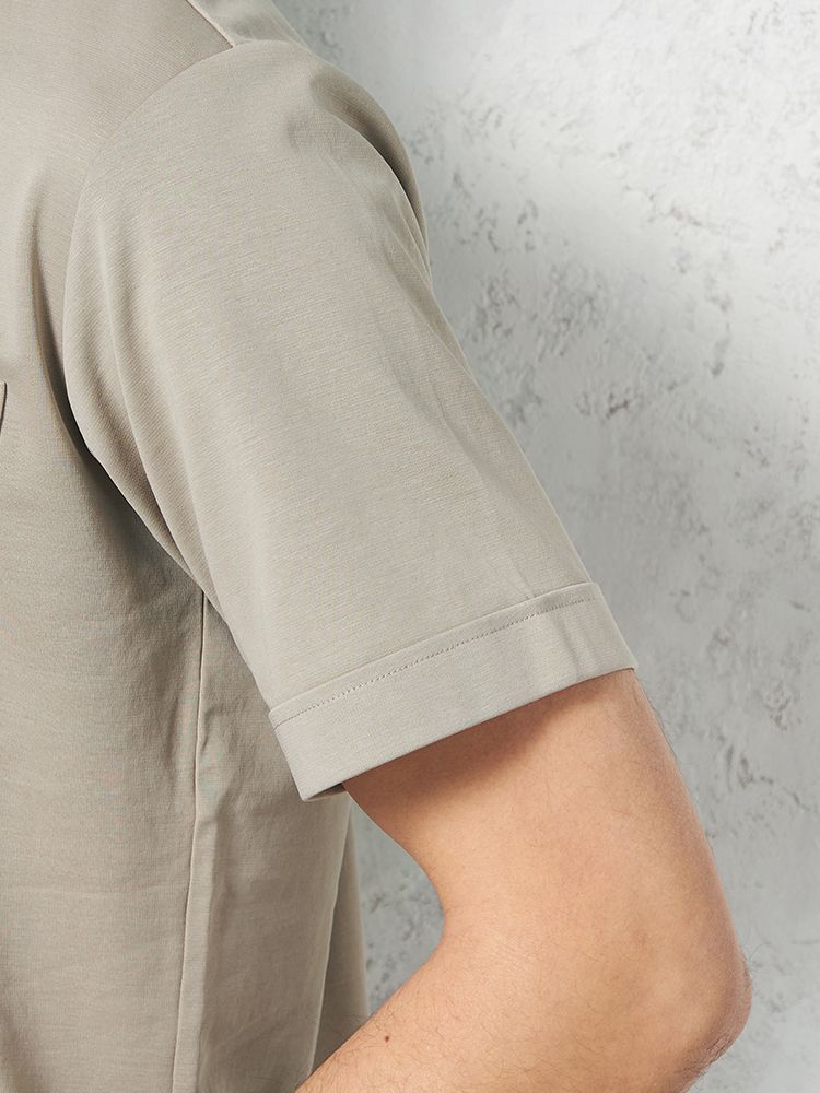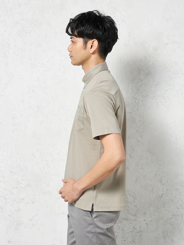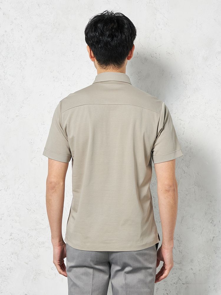 コットン100%で優しい肌触りでありながら、膨らみがあり適度なハリコシがあるダブルジャージ構造と、シルケット加工で生地表面に光沢を出したことにより、キレイ目な仕上がりを実現。