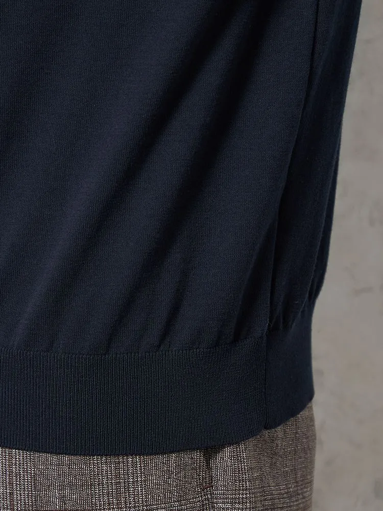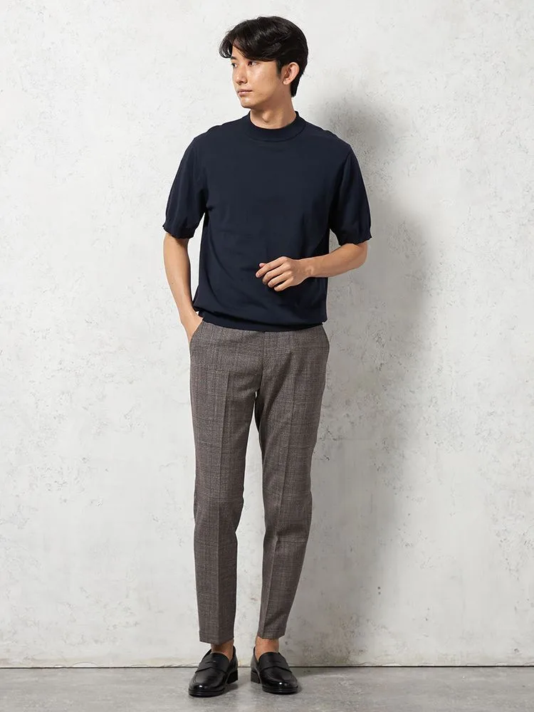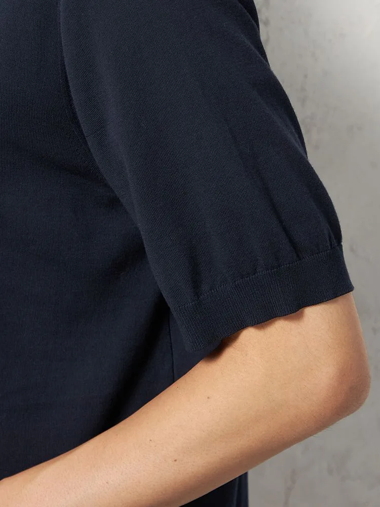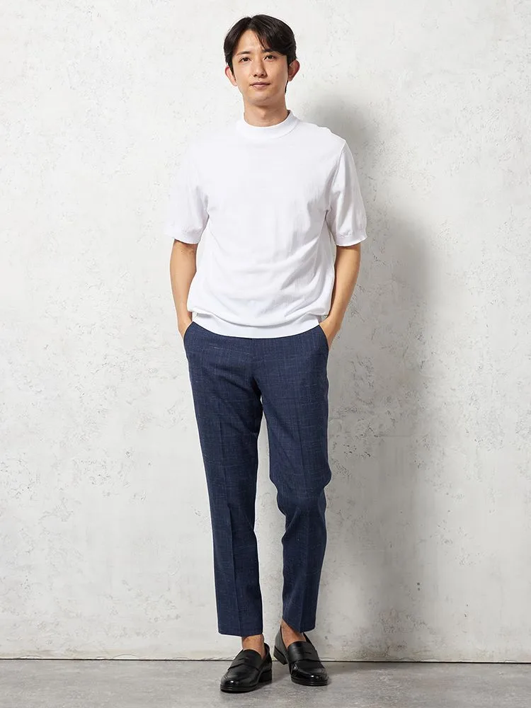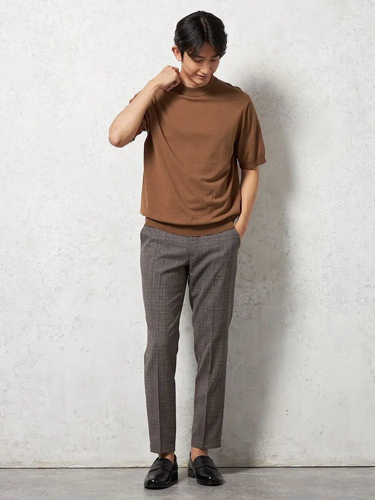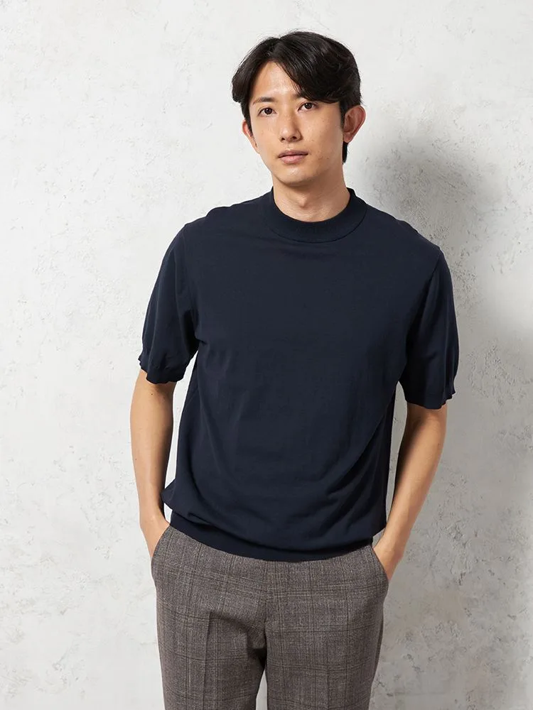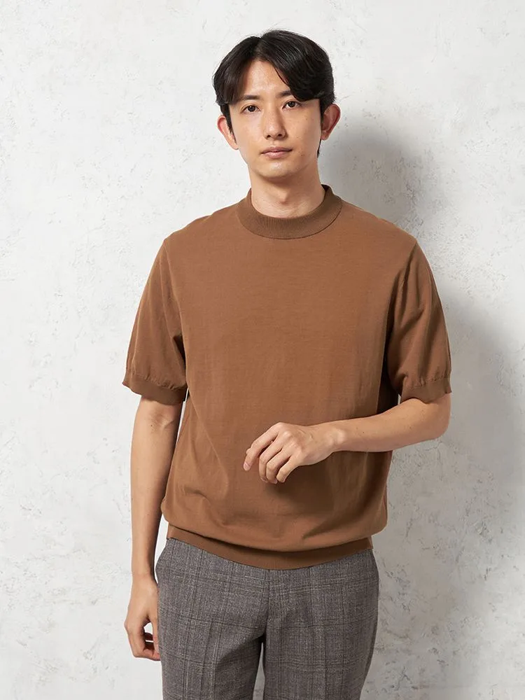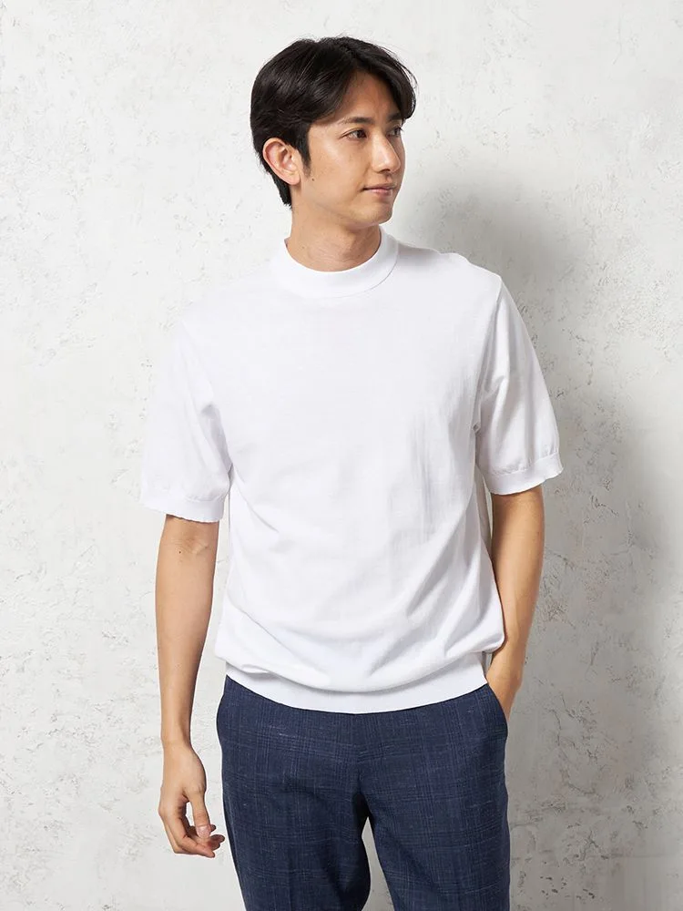 綿100%素材を使用した、シンプルで高い着回し力を発揮する、半袖のニットTシャツ。