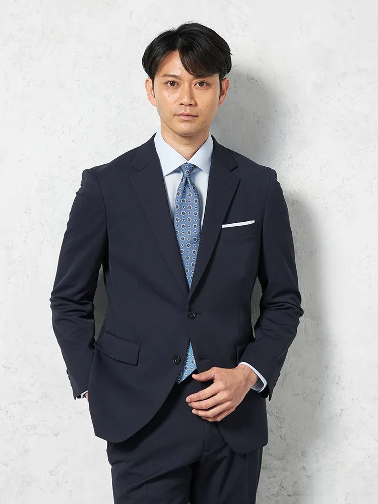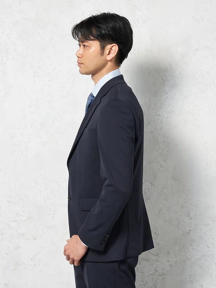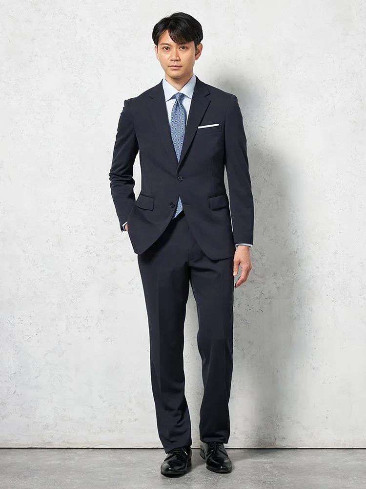 軽量ニット素材を使用した着心地とイージーケア性が魅力のツーピーススーツ。