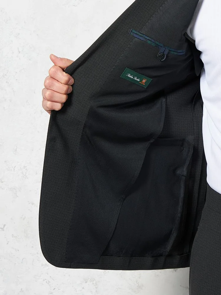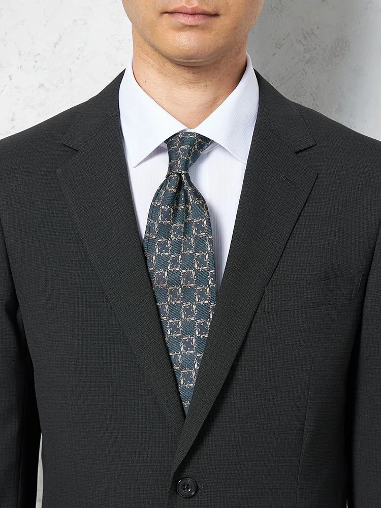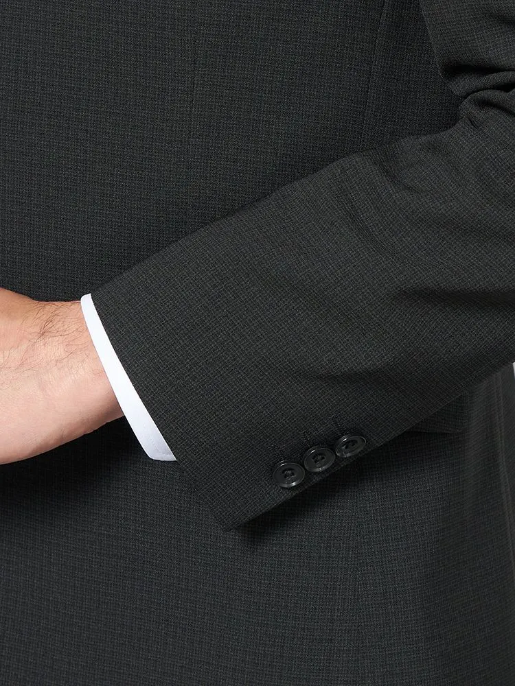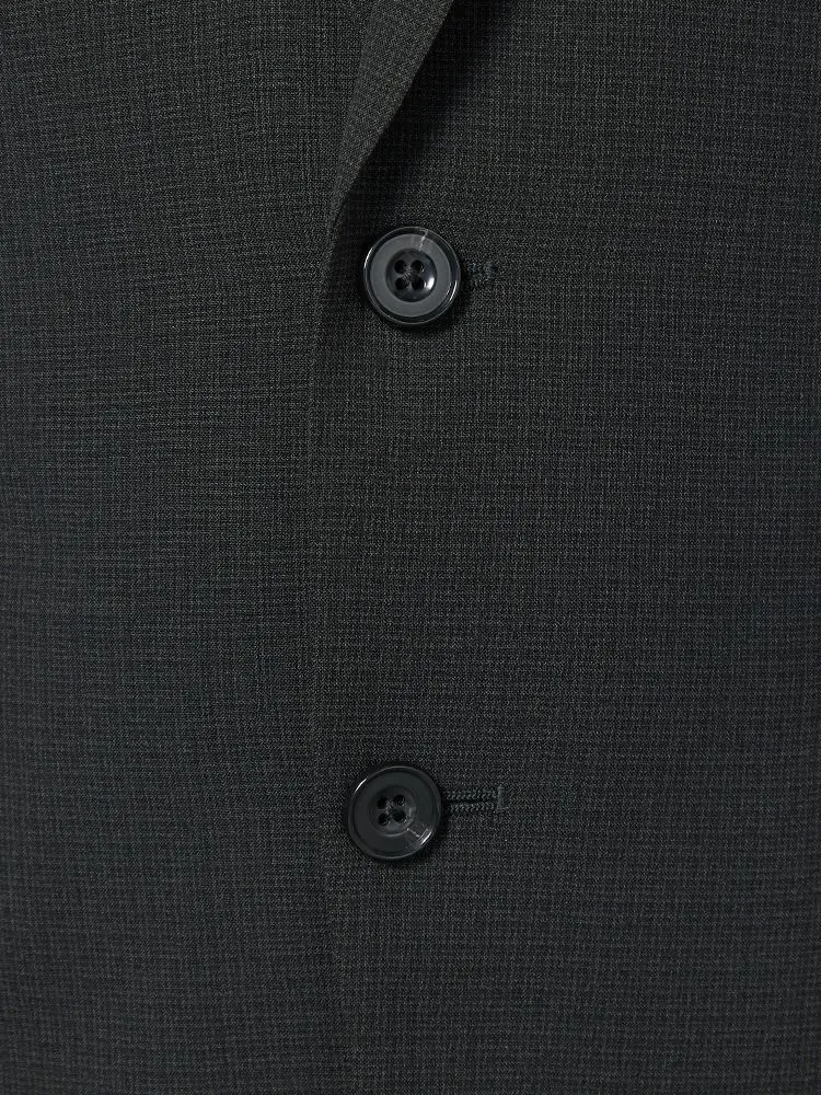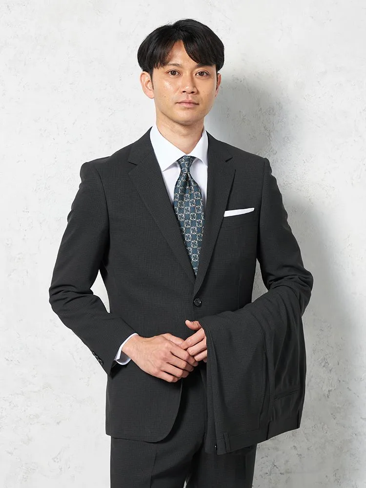 ダークトーンのチェック柄の2ピーススーツです。