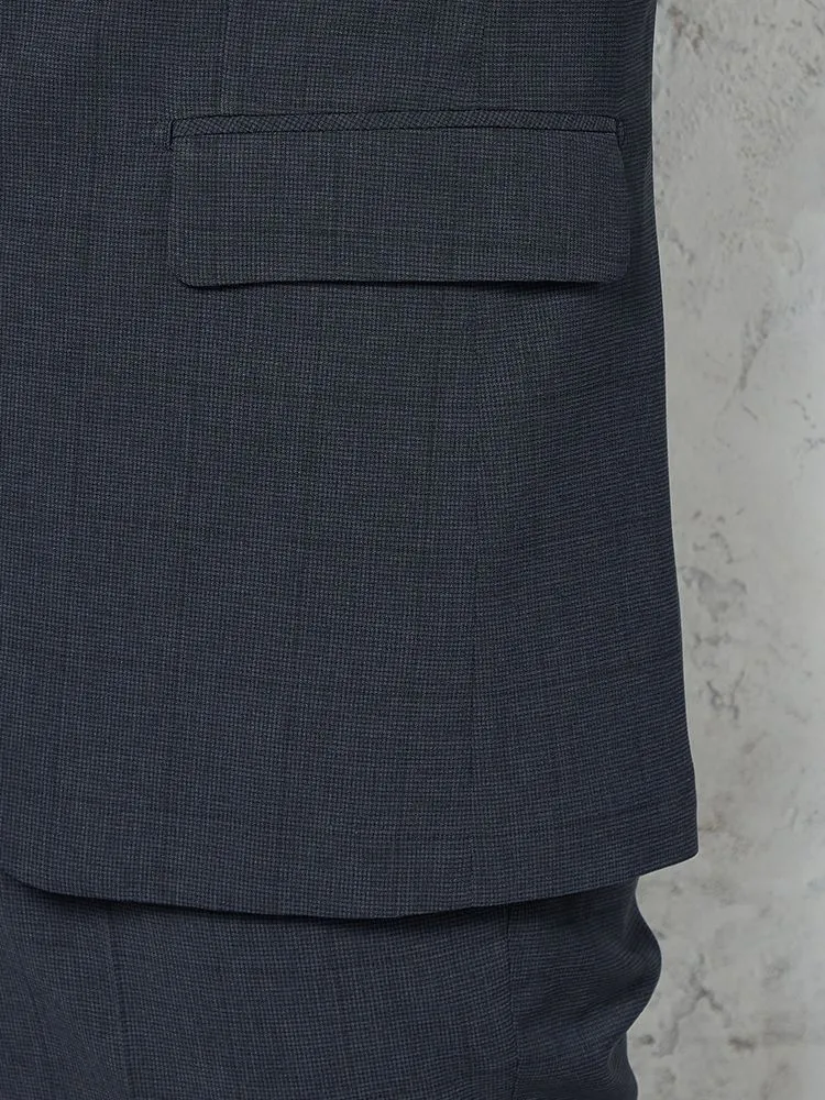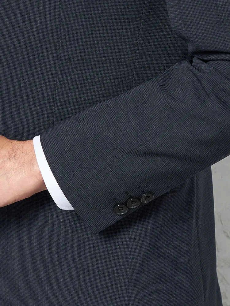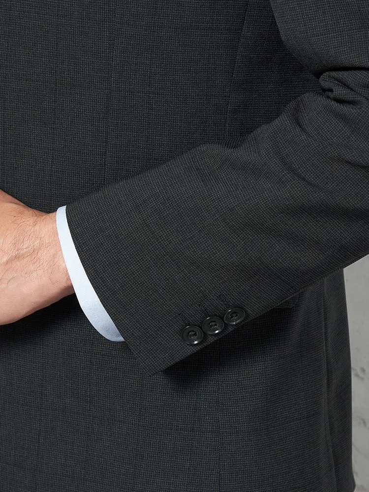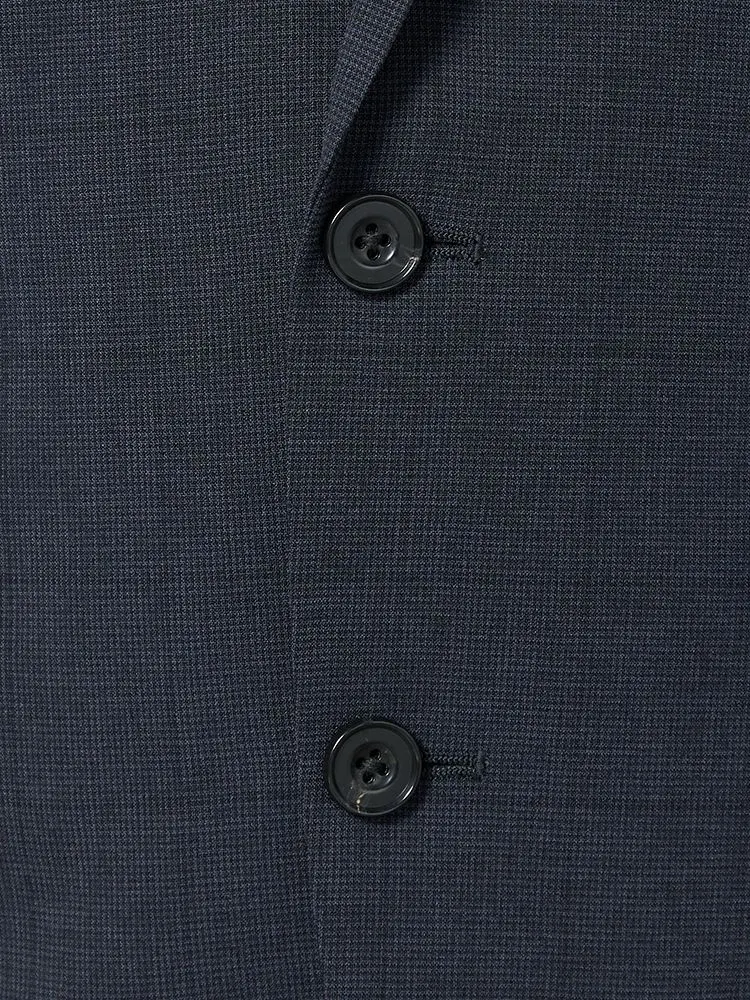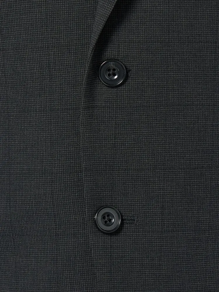細かいチェック柄が特徴的な2ピーススーツです。