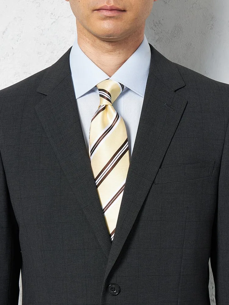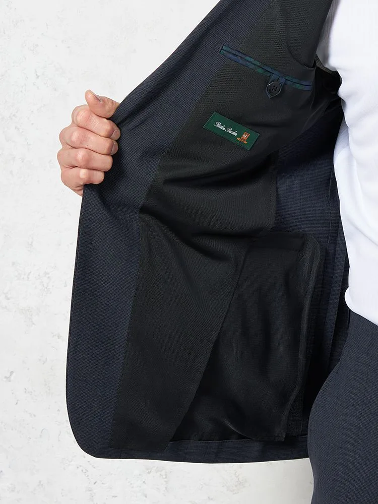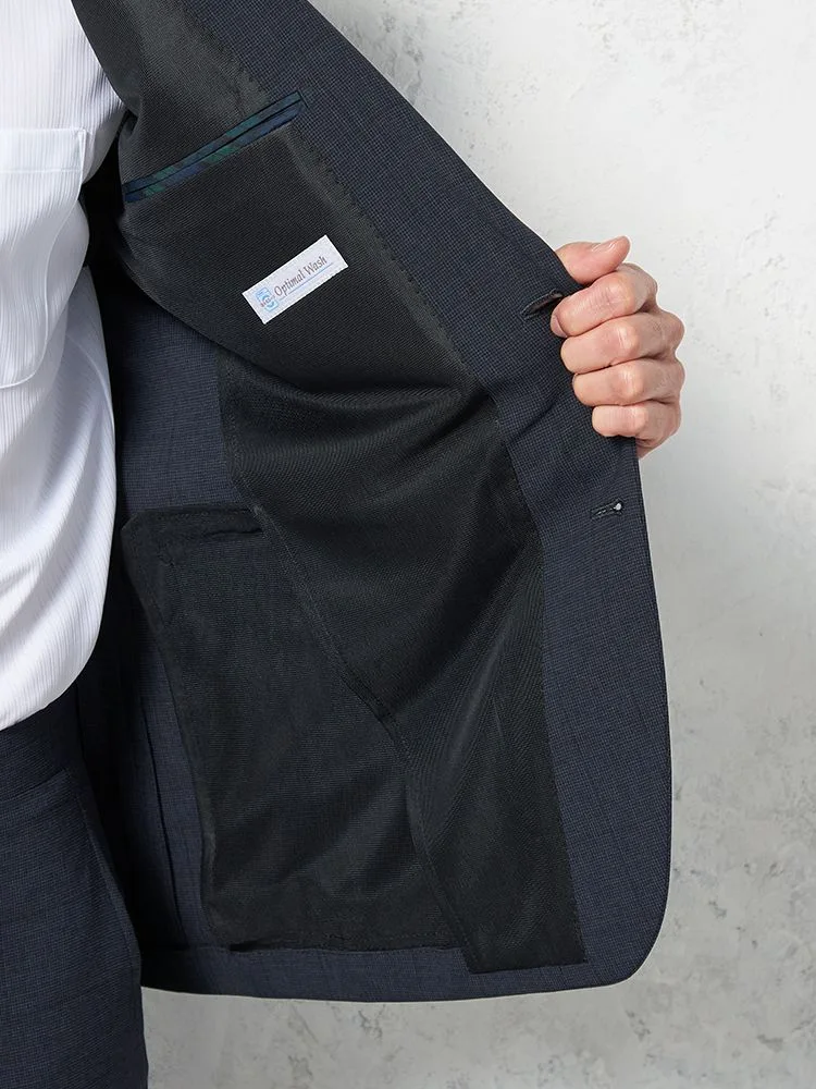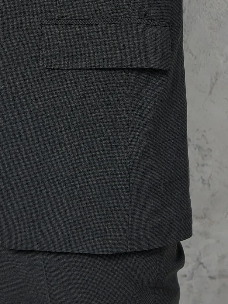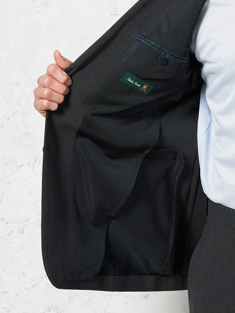 細かいチェック柄が特徴的な2ピーススーツです。