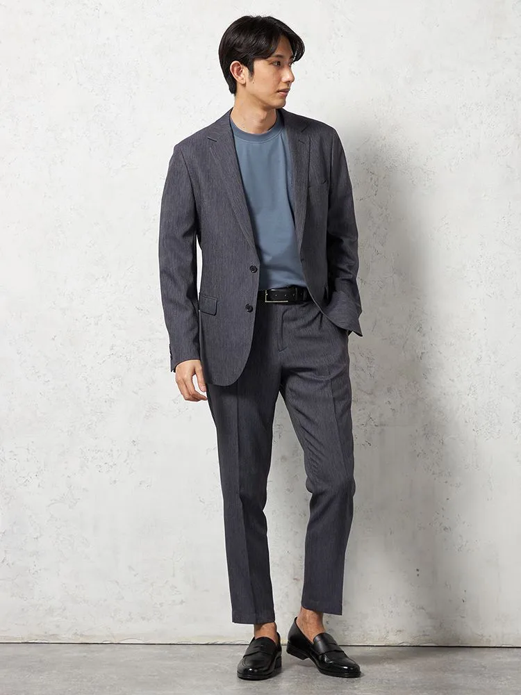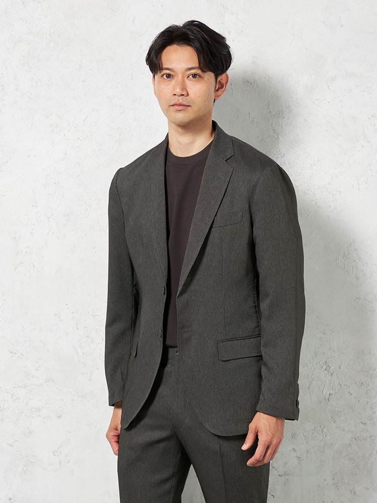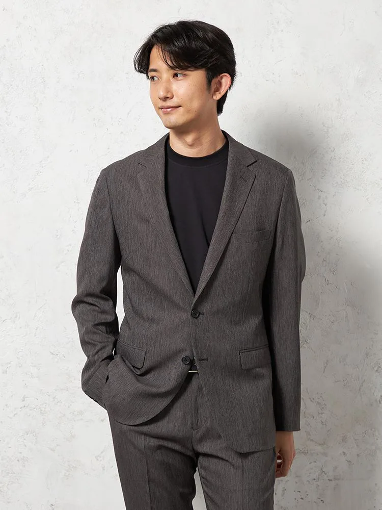 素材感で個性を出せるよう、ジャケット、パンツともにベーシックなデザインで仕上げられています。