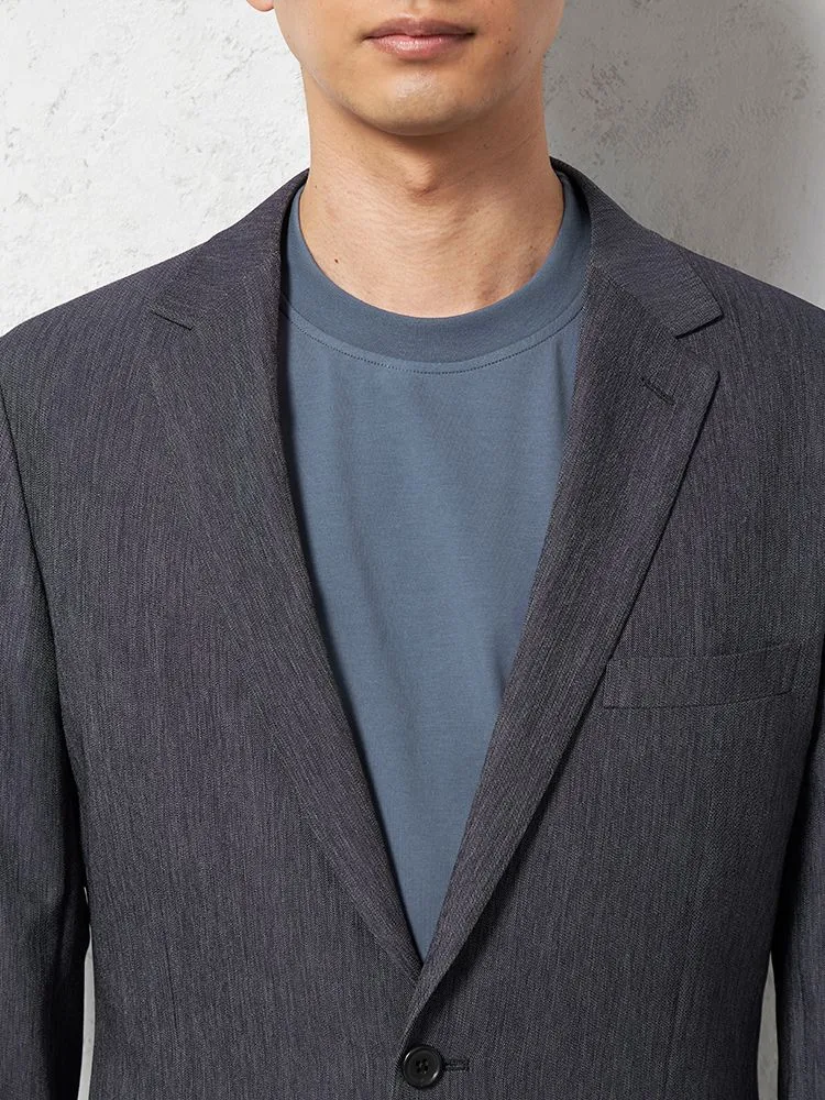 デニム生地で仕立てた、モダンな表情の2つボタンセットアップスーツ。