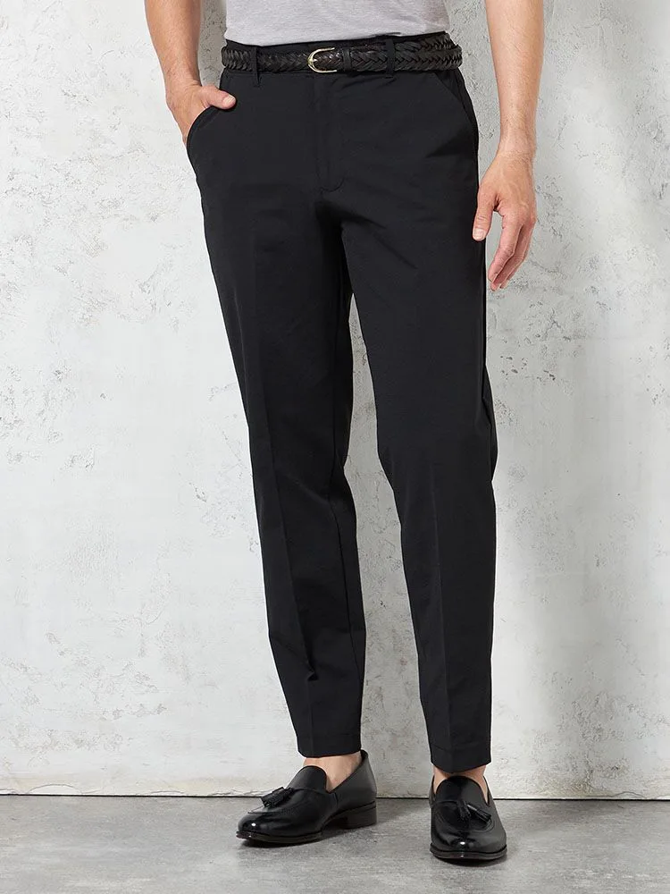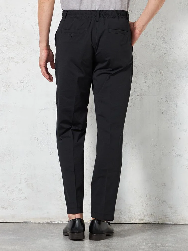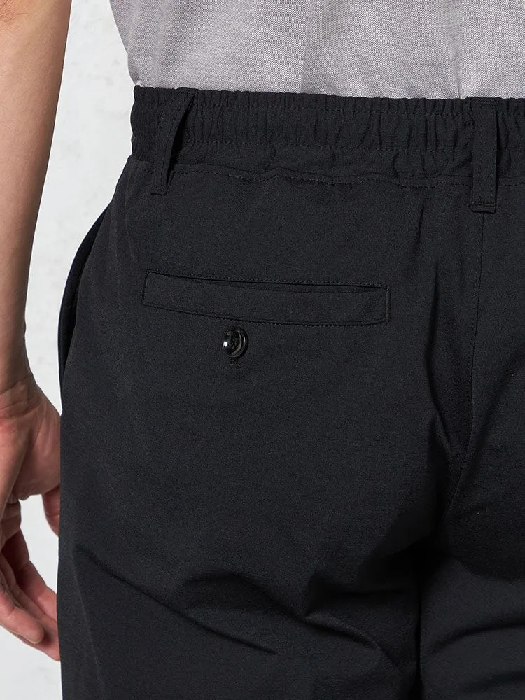 パンツの腰回りに生地の折り込みがなく、スッキリとしたシルエットを実現します。シンプルで洗練された印象を与え、すっきりとした着こなしが可能です。