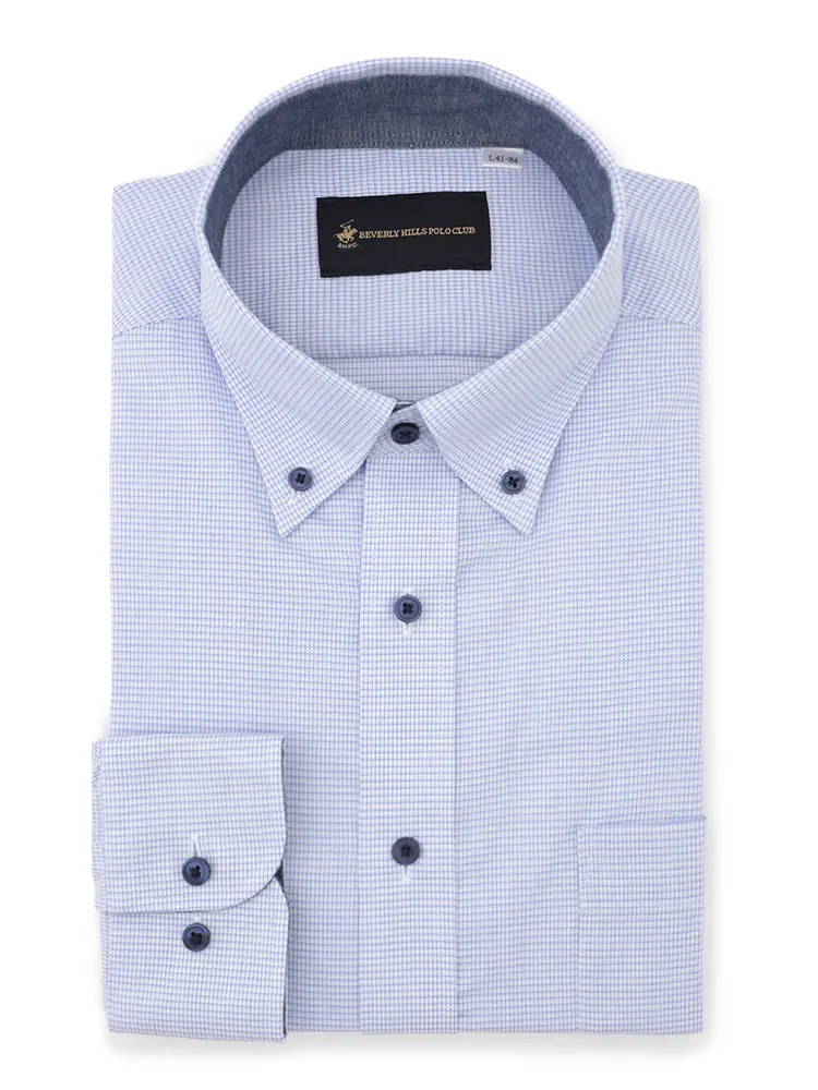 【ビバリーヒルズポロクラブ】 サックスチェック 長袖Yシャツ ボタンダウン マイクロチェック 形態安定 通年
