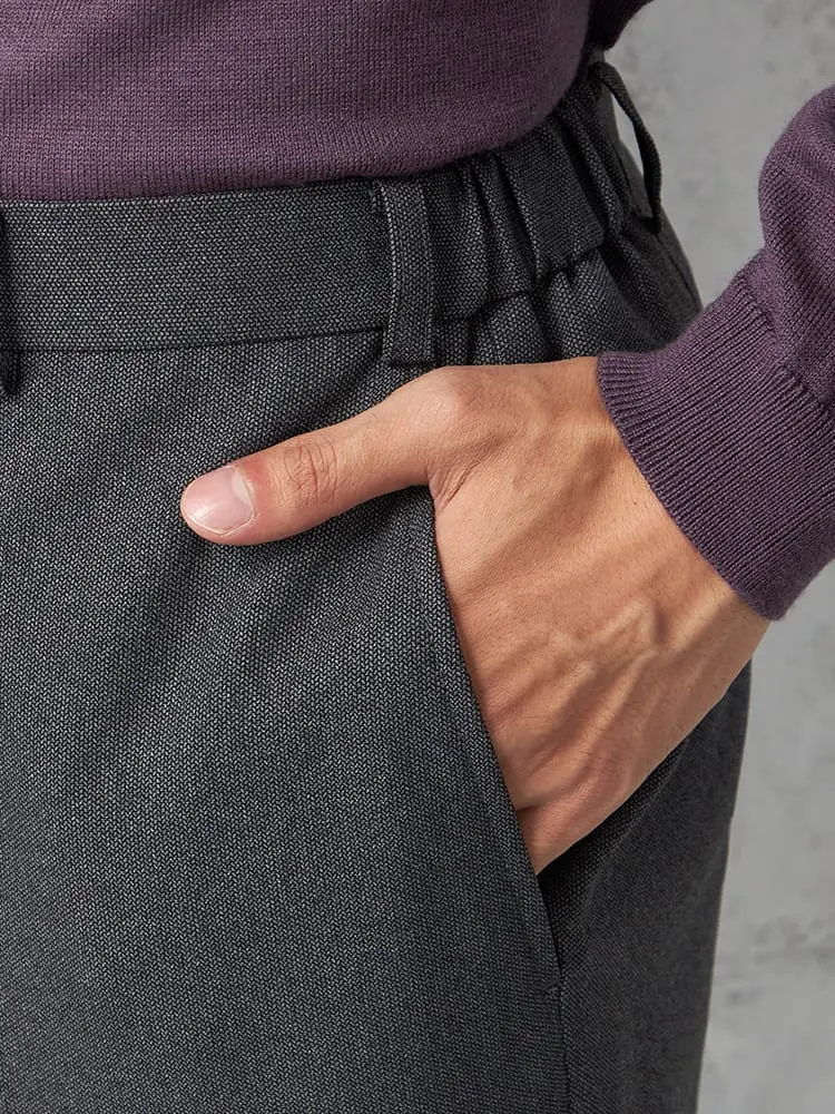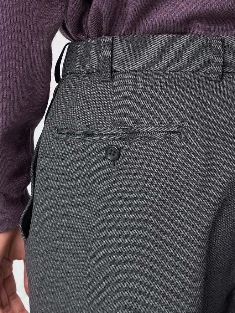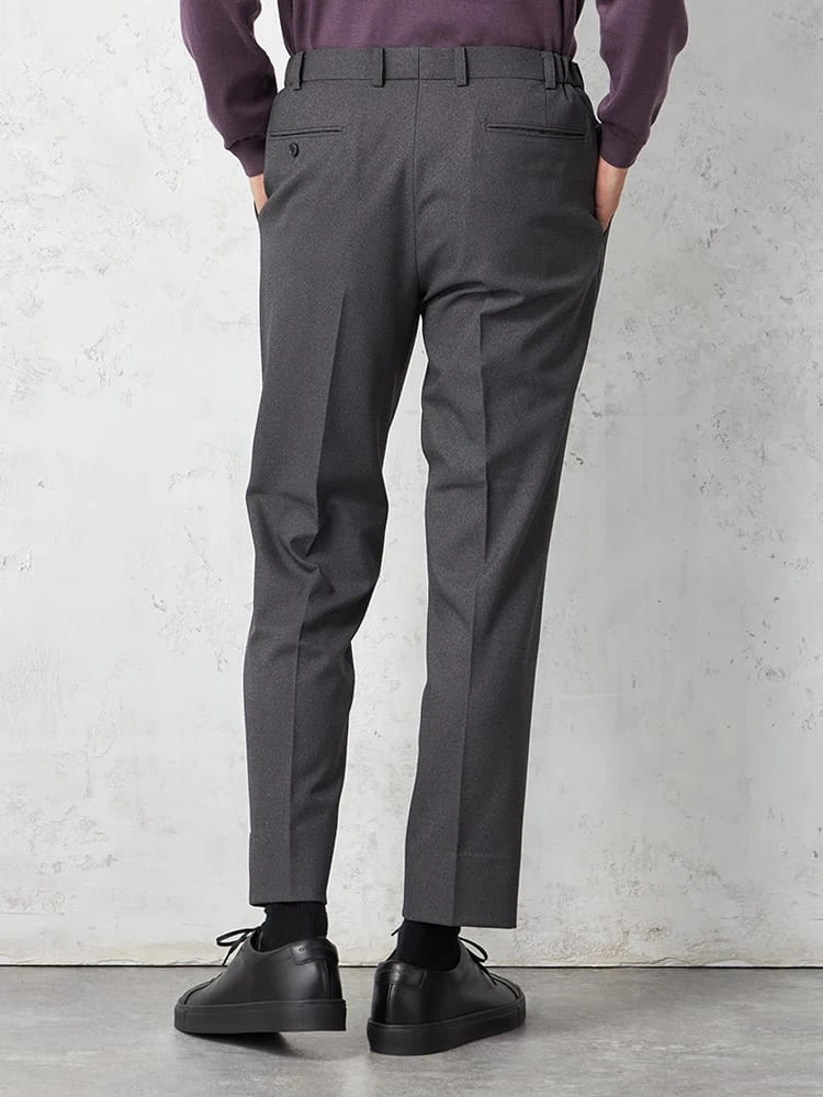 パンツの腰回りに生地の折り込みがなく、スッキリとしたシルエットを実現します。シンプルで洗練された印象を与え、すっきりとした着こなしが可能です。