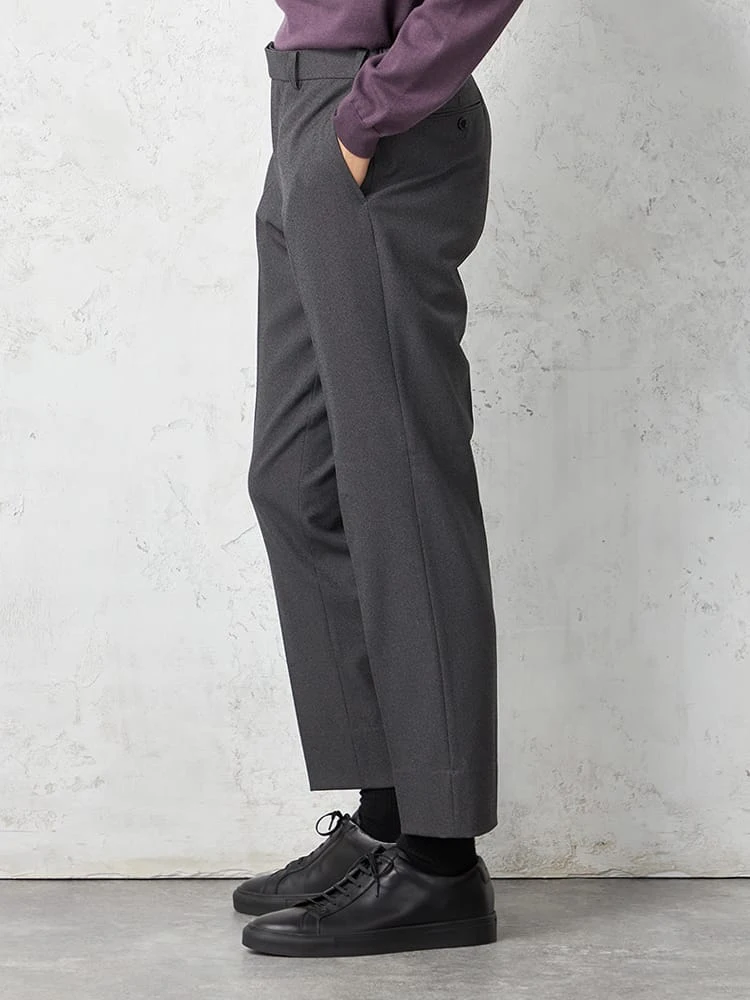 センタークリースの効いた一本で、ウエストはサイドギャザー仕様のフロント持ち出し付き。