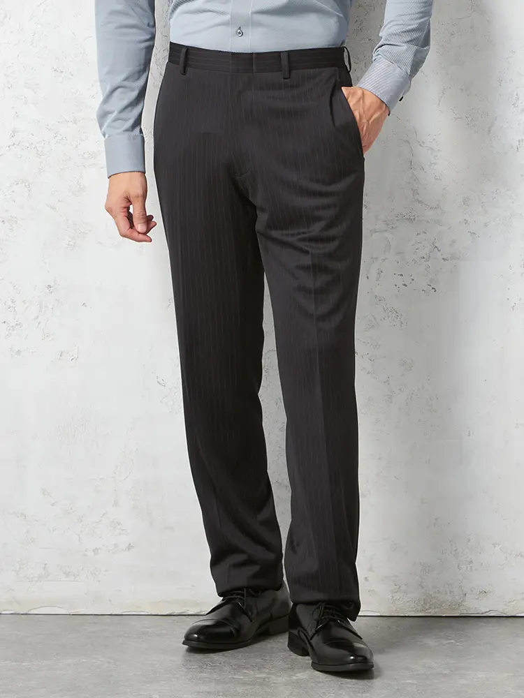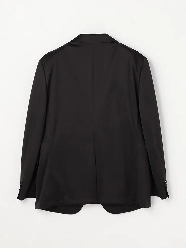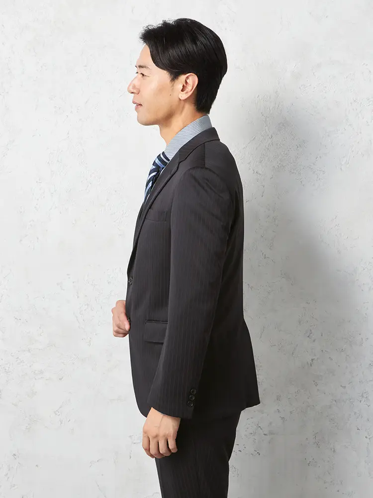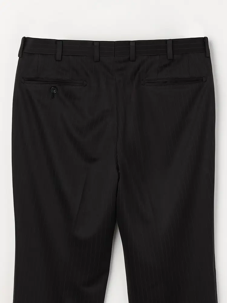 繊細なストライプが着こなしを引き締めるセンターベントのノータックスーツ。